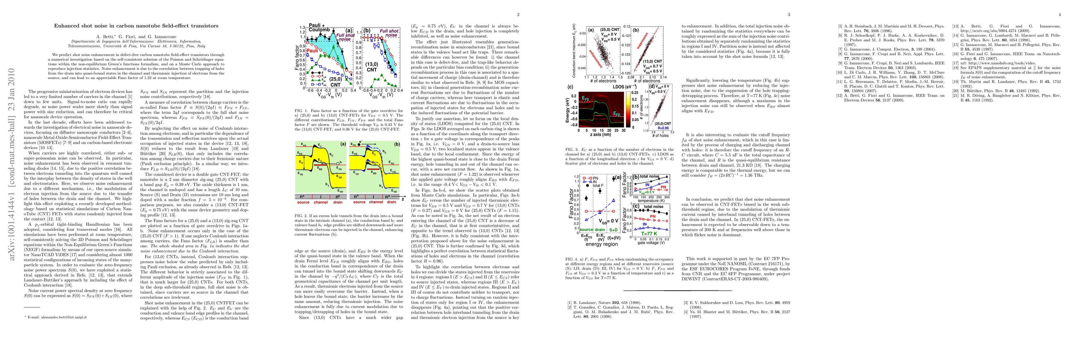 The study predicts enhanced shot noise in defect-free carbon nanotube field-effect transistors due to correlations between hole trapping and electron injection, resulting in a Fano factor of 1.22 at room temperature, based on numerical simulations using the non-equilibrium Green functions and Monte Carlo methods.