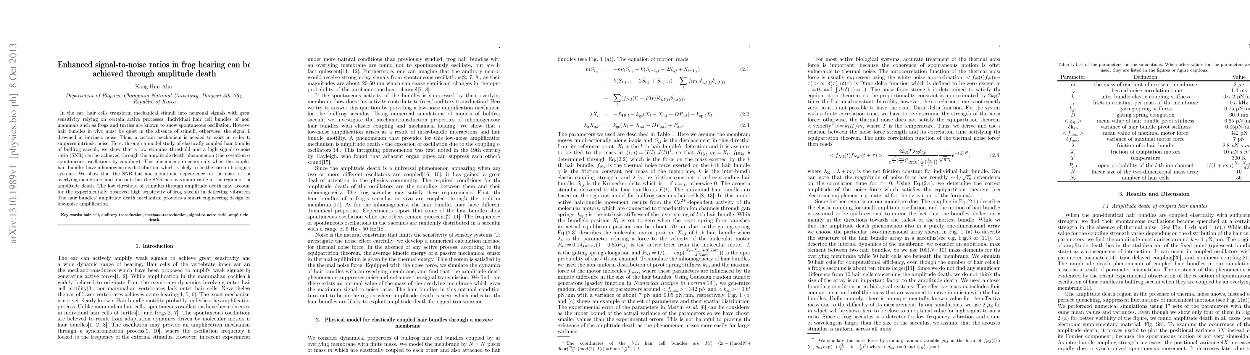 In the ear, hair cells transform mechanical stimuli into neuronal signals with great sensitivity relying on certain active processes. Individual hair cell bundles of non-mammals such as frogs and turtles are known to show spontaneous oscillation. However hair bundles in vivo must be quiet in the absence of stimuli, otherwise, the signal is drowned in intrinsic noise. Thus, a certain mechanism is needed to exist in order to suppress intrinsic noise. Here, through a model study of elastically coupled hair bundles of bullfrog sacculi, we show that a low stimulus threshold and a high signal-to-noise ratio (SNR) can be achieved through the amplitude death phenomenon (the cessation of spontaneous oscillations by coupling). This phenomenon occurs only when the coupled hair bundles have inhomogeneous distribution, which is likely to be the case in biological systems. We show that the SNR has non-monotonic dependence on the mass of the overlying membrane, and find out that the SNR has maximum value in the region of the amplitude death. The low threshold of stimulus through amplitude death may account for the experimentally observed high sensitivity of frog sacculi in detecting vibration. The hair bundles' amplitude death mechanism provides a smart engineering design for low-noise amplification.