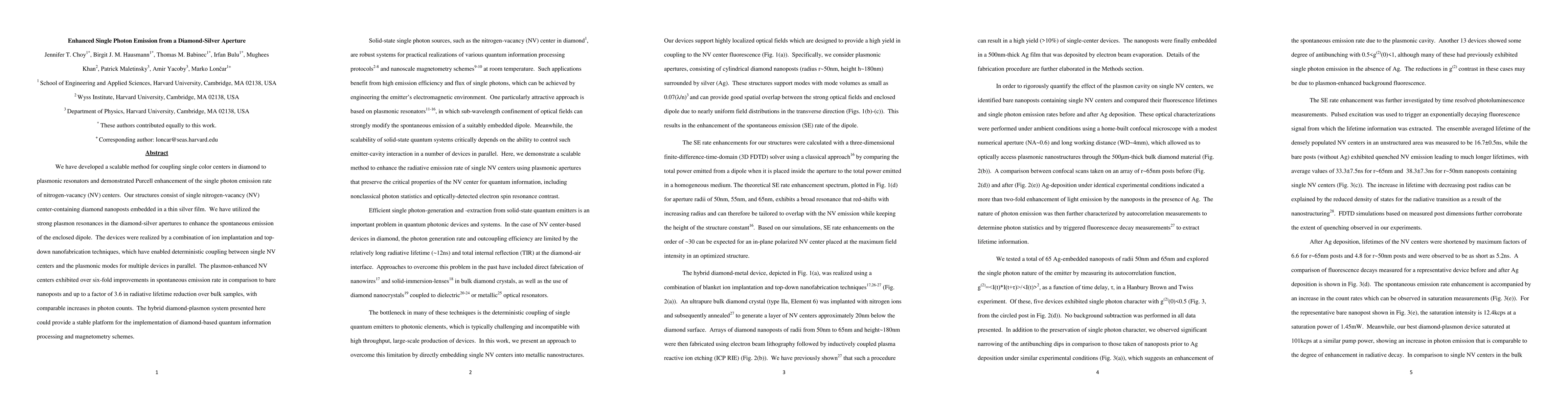 This paper presents a scalable method to couple nitrogen-vacancy centers in diamond to plasmonic resonators, achieving significant Purcell enhancement of single photon emission rates through diamond-silver apertures. The hybrid system shows a six-fold increase in emission rate and a 3.6-fold reduction in radiative lifetime, promising for quantum information and magnetometry applications.