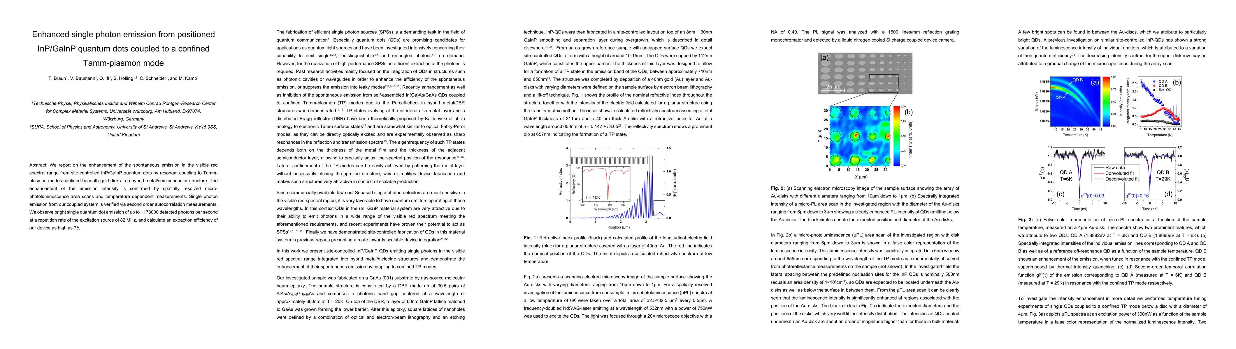 This paper demonstrates enhanced single photon emission from InP/GaInP quantum dots coupled to Tamm-plasmon modes beneath gold disks, achieving up to 173,000 detected photons per second and a 7% extraction efficiency. The enhancement is confirmed by microphotoluminescence and temperature-dependent measurements.