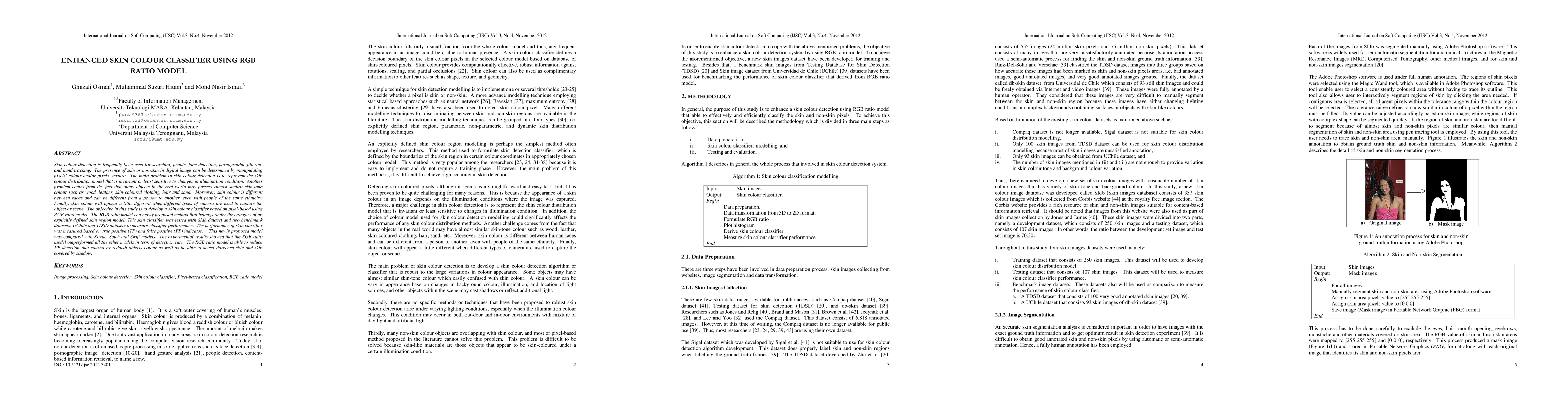 A new skin color classification model using an RGB ratio model was developed to improve accuracy in detecting skin tones across different lighting conditions, camera types, and ethnicities.