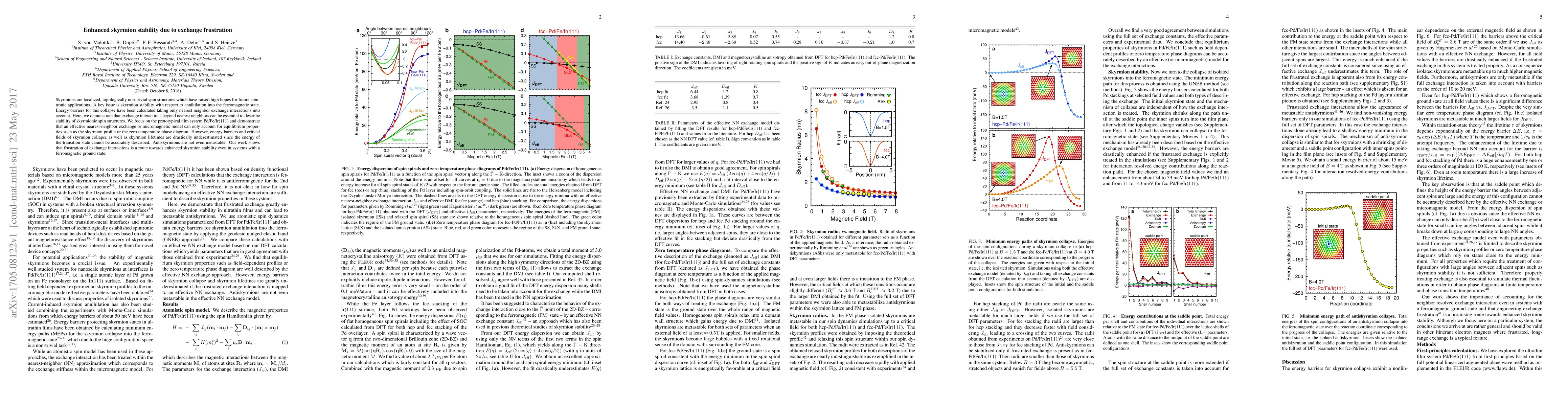 Skyrmions are localized, topologically non-trivial spin structures which have raised high hopes for future spintronic applications. A key issue is skyrmion stability with respect to annihilation into the ferromagnetic state. Energy barriers for this collapse have been calculated taking only nearest neighbor exchange interactions into account. Here, we demonstrate that exchange interactions beyond nearest neighbors can be essential to describe stability of skyrmionic spin structures. We focus on the prototypical film system Pd/Fe/Ir(111) and demonstrate that an effective nearest-neighbor exchange or micromagnetic model can only account for equilibrium properties such as the skyrmion profile or the zero temperature phase diagram. However, energy barriers and critical fields of skyrmion collapse as well as skyrmion lifetimes are drastically underestimated since the energy of the transition state cannot be accurately described. Antiskyrmions are not even metastable. Our work shows that frustration of exchange interactions is a route towards enhanced skyrmion stability even in systems with a ferromagnetic ground state.