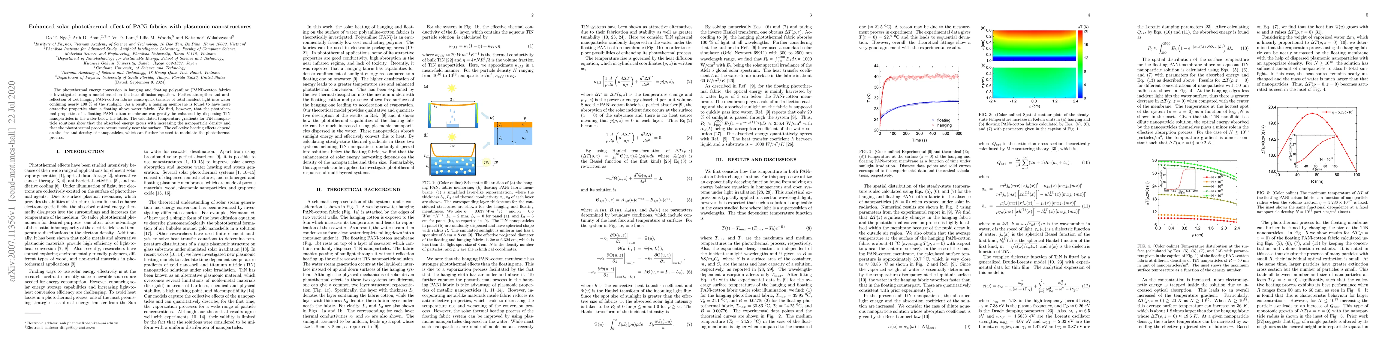 This research investigates the enhanced solar photothermal effect of polyaniline (PANi) fabrics through the addition of plasmonic TiN nanoparticles, showing that wet hanging PANi-cotton membranes efficiently convert sunlight into heat. Dispersing TiN nanoparticles in water beneath floating PANi-cotton membranes further amplifies the photothermal conversion, with temperature gradients dependent on nanoparticle size and density.
