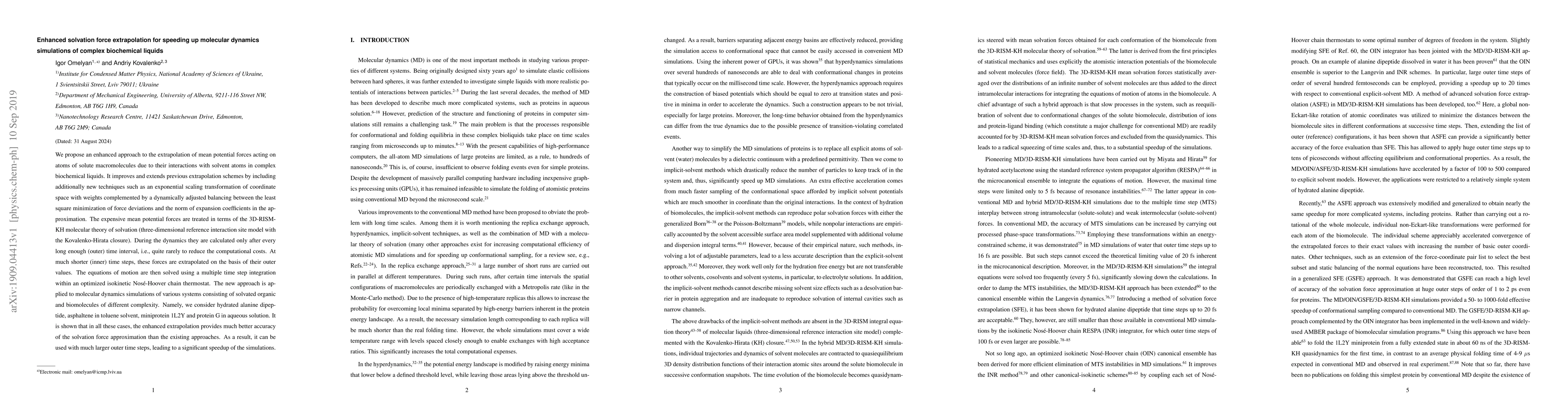 This research introduces an improved method for estimating solvation forces in molecular dynamics simulations of complex biochemical liquids, enhancing accuracy and speed. It combines 3D-RISM-KH theory with exponential scaling and dynamic balancing techniques, allowing larger time steps and significant computational cost reduction in simulations of various biomolecular systems.