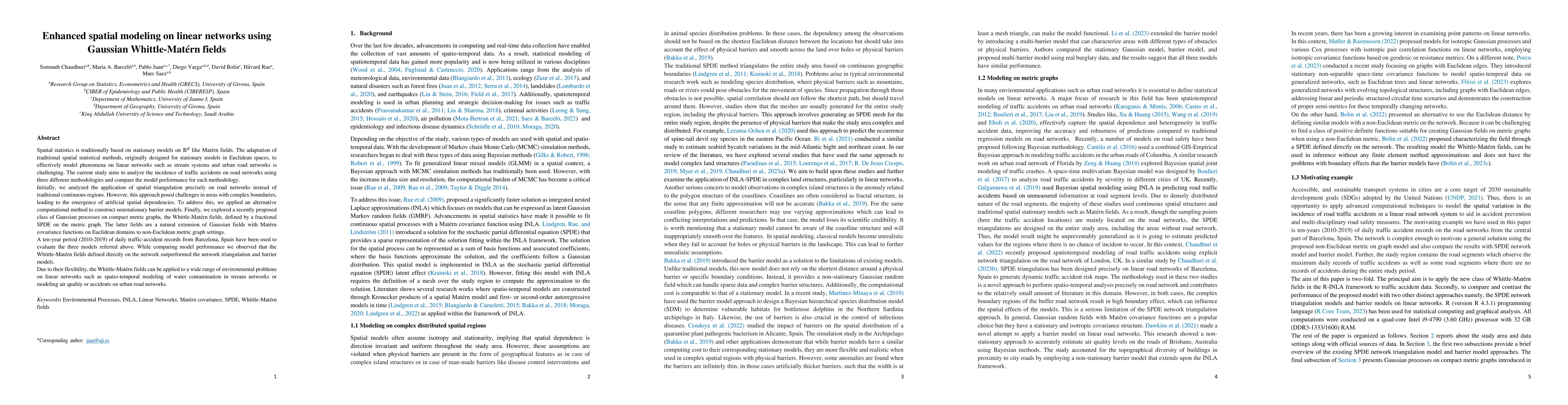 Spatial statistics is traditionally based on stationary models on $\mathbb{R^d}$ like Mat\'ern fields. The adaptation of traditional spatial statistical methods, originally designed for stationary models in Euclidean spaces, to effectively model phenomena on linear networks such as stream systems and urban road networks is challenging. The current study aims to analyze the incidence of traffic accidents on road networks using three different methodologies and compare the model performance for each methodology. Initially, we analyzed the application of spatial triangulation precisely on road networks instead of traditional continuous regions. However, this approach posed challenges in areas with complex boundaries, leading to the emergence of artificial spatial dependencies. To address this, we applied an alternative computational method to construct nonstationary barrier models. Finally, we explored a recently proposed class of Gaussian processes on compact metric graphs, the Whittle-Mat\'ern fields, defined by a fractional SPDE on the metric graph. The latter fields are a natural extension of Gaussian fields with Mat\'ern covariance functions on Euclidean domains to non-Euclidean metric graph settings. A ten-year period (2010-2019) of daily traffic-accident records from Barcelona, Spain have been used to evaluate the three models referred above. While comparing model performance we observed that the Whittle-Mat\'ern fields defined directly on the network outperformed the network triangulation and barrier models. Due to their flexibility, the Whittle-Mat\'ern fields can be applied to a wide range of environmental problems on linear networks such as spatio-temporal modeling of water contamination in stream networks or modeling air quality or accidents on urban road networks.
