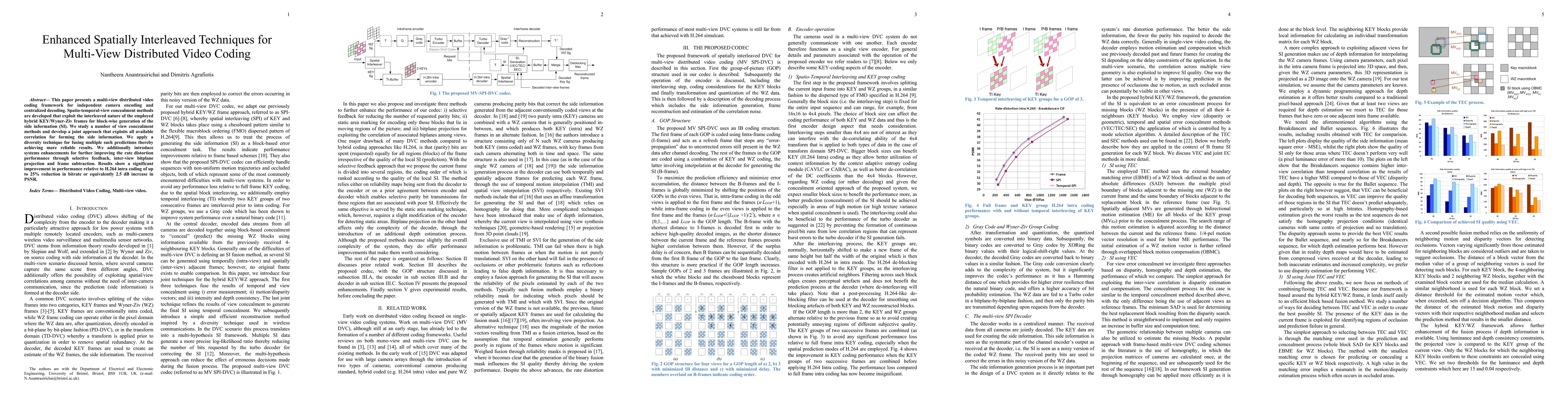 This paper proposes advanced techniques for multi-view distributed video coding, utilizing interleaved hybrid KEY/Wyner-Ziv frames to generate side information and achieve spatial-temporal-view concealment. The study introduces a joint approach and diversity fusion for improved reliability, along with system enhancements that lead to up to a 25% reduction in bitrate or a 2.5 dB increase in PSNR compared to H.264 intra coding.
