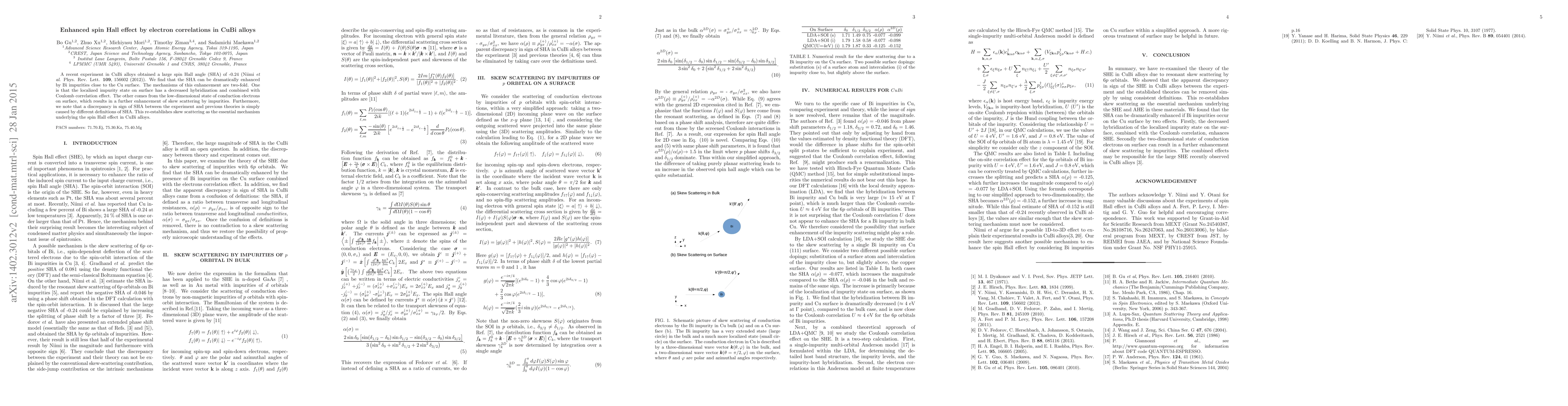 This paper investigates the enhanced spin Hall effect in CuBi alloys, attributing a significant increase in spin Hall angle to Bi impurities near the Cu surface. The enhancement is due to decreased hybridization of localized impurity states and Coulomb correlation effects, along with the effect of low-dimensional surface electron states. The study resolves discrepancies in SHA sign by clarifying the definition used.