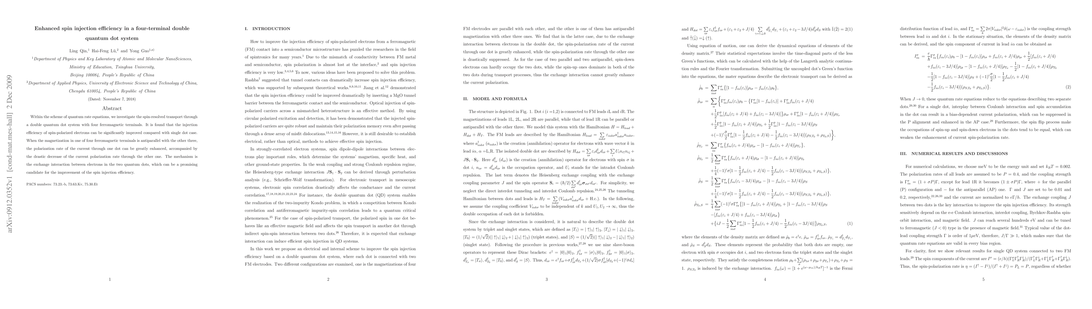 Researchers found that a four-terminal double quantum dot system can significantly improve spin injection efficiency by using exchange interaction between electrons in the two dots, enhancing polarization rate for one dot while decreasing it for another.
