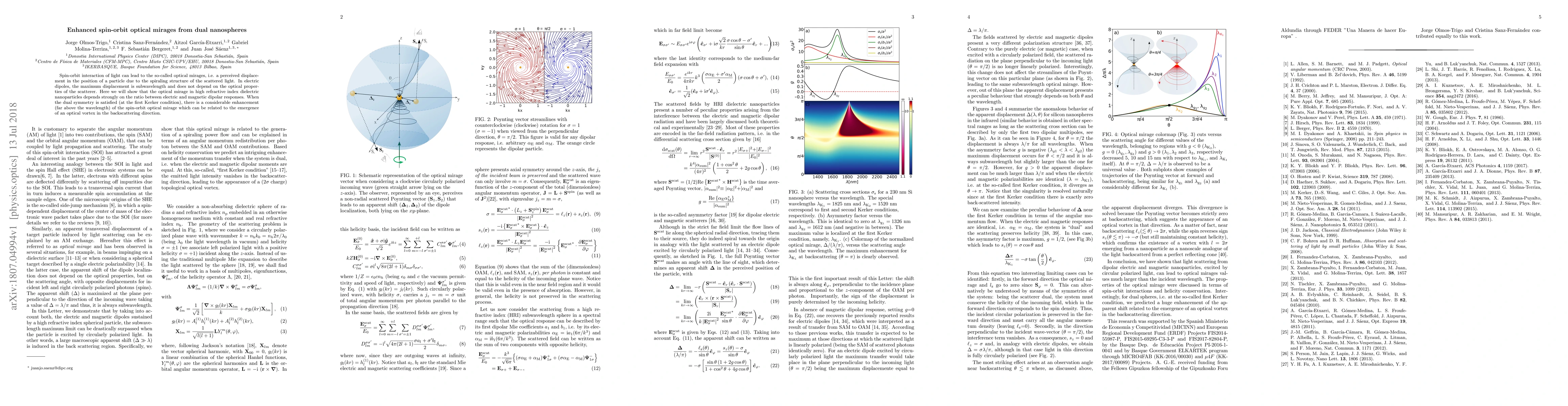 Spin-orbit interaction of light can lead to the so-called optical mirages, i.e. a perceived displacement in the position of a particle due to the spiraling structure of the scattered light. In electric dipoles, the maximum displacement is subwavelength and does not depend on the optical properties of the scatterer. Here we will show that the optical mirage in high refractive index dielectric nanoparticles depends strongly on the ratio between electric and magnetic dipolar responses. When the dual symmetry is satisfied (at the first Kerker condition), there is a considerable enhancement (far above the wavelength) of the spin-orbit optical mirage which can be related to the emergence of an optical vortex in the backscattering direction.