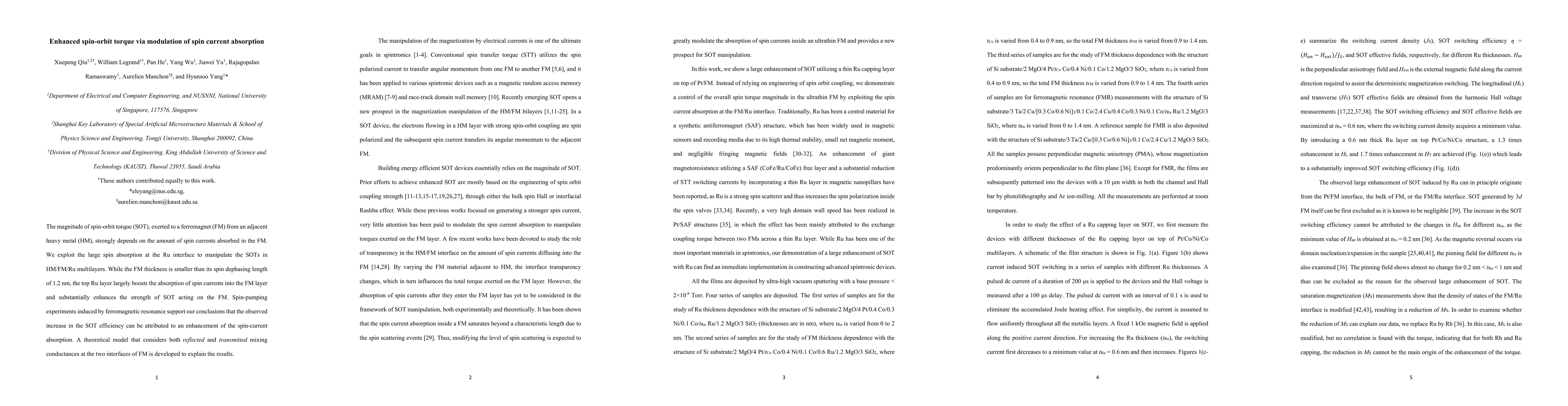 The magnitude of spin-orbit torque (SOT), exerted to a ferromagnet (FM) from an adjacent heavy metal (HM), strongly depends on the amount of spin currents absorbed in the FM. We exploit the large spin absorption at the Ru interface to manipulate the SOTs in HM/FM/Ru multilayers. While the FM thickness is smaller than its spin dephasing length of 1.2 nm, the top Ru layer largely boosts the absorption of spin currents into the FM layer and substantially enhances the strength of SOT acting on the FM. Spin-pumping experiments induced by ferromagnetic resonance support our conclusions that the observed increase in the SOT efficiency can be attributed to an enhancement of the spin-current absorption. A theoretical model that considers both reflected and transmitted mixing conductances at the two interfaces of FM is developed to explain the results.