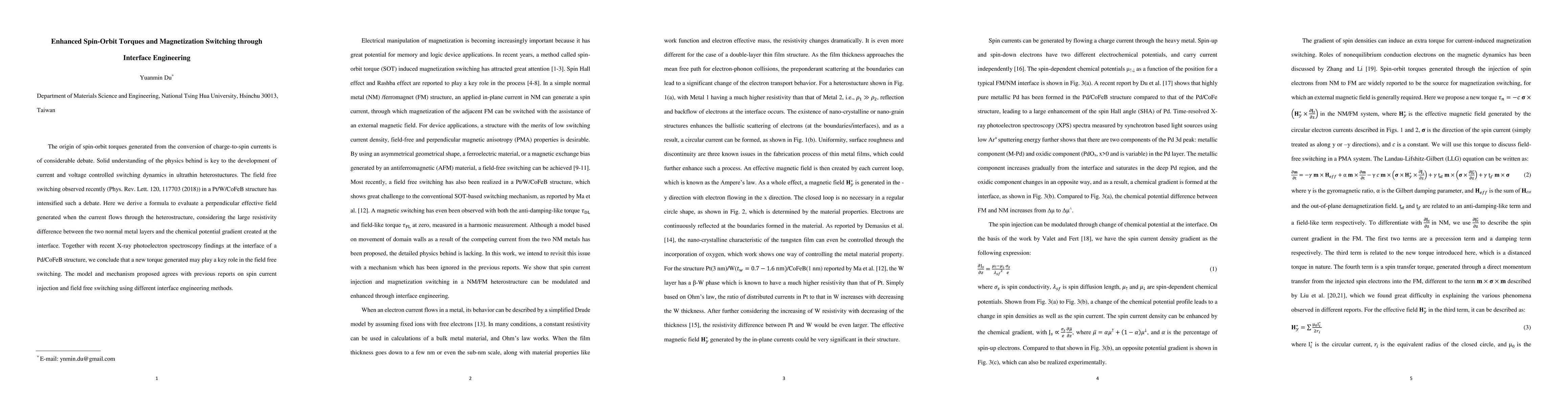 The origin of spin-orbit torques generated from the conversion of charge-to-spin currents is of considerable debate. Solid understanding of the physics behind is key to the development of current and voltage controlled switching dynamics in ultrathin heterostuctures. The field free switching observed recently (Phys. Rev. Lett. 120, 117703 (2018)) in a Pt/W/CoFeB structure has intensified such a debate. Here we derive a formula to evaluate a perpendicular effective field generated when the current flows through the heterostructure, considering the large resistivity difference between the two normal metal layers and the chemical potential gradient created at the interface. Together with recent X-ray photoelectron spectroscopy findings at the interface of a Pd/CoFeB structure, we conclude that a new torque generated may play a key role in the field free switching. The model and mechanism proposed agrees with previous reports on spin current injection and field free switching using different interface engineering methods.
