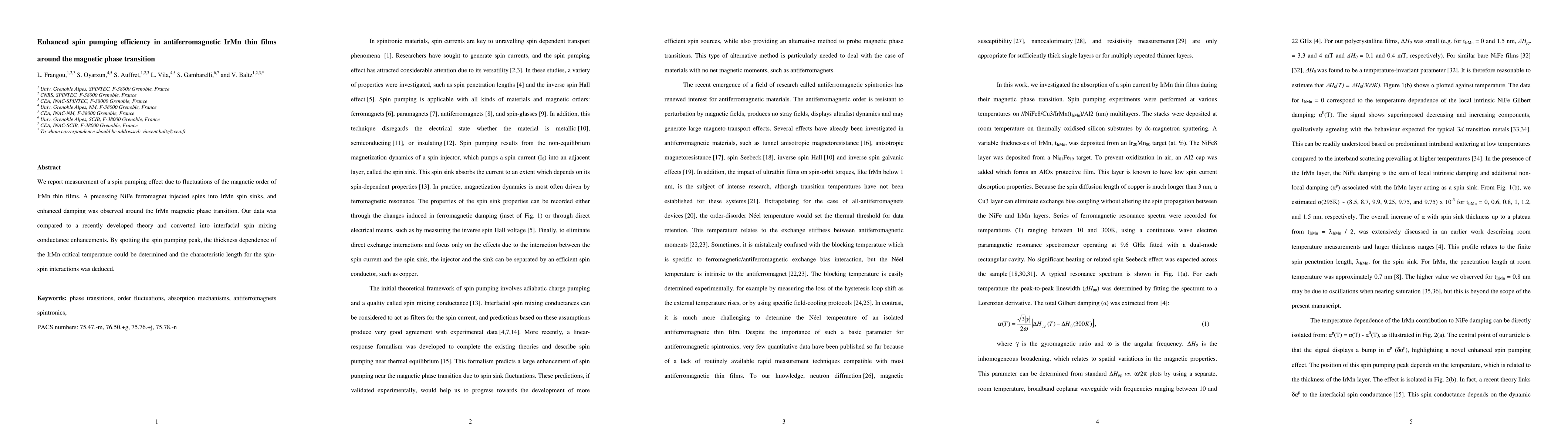 This study measures enhanced spin pumping efficiency in IrMn thin films near their magnetic phase transition, revealing increased damping due to spin fluctuations. The findings align with a new theoretical model, providing insights into the thickness dependence of the critical temperature and the characteristic length of spin-spin interactions.