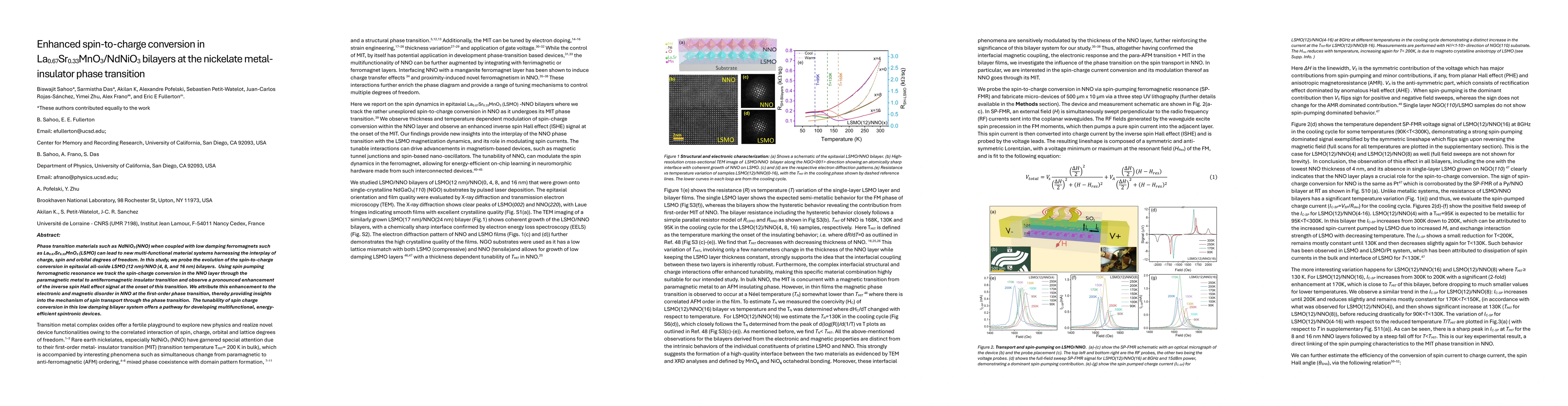 The paper presents a detailed analysis of spin-charge conversion in LSMO/NNO bilayers using SP-FMR, revealing enhanced ISHE signal at the NNO MIT due to electronic and magnetic disorder.