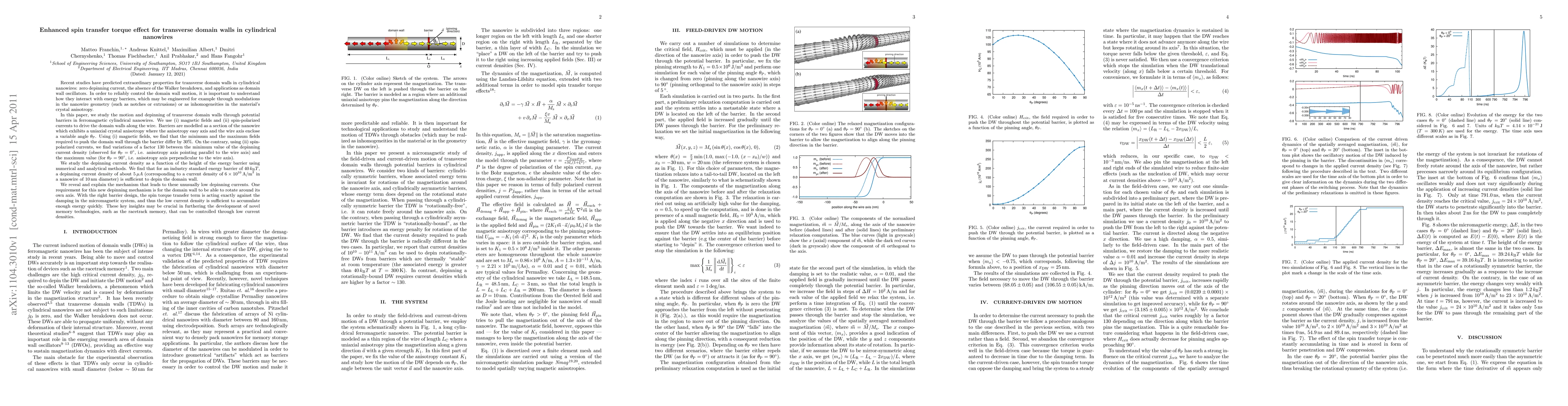 This paper investigates the enhanced spin transfer torque effect on transverse domain walls in cylindrical nanowires, finding that depinning currents can be dramatically reduced through a novel mechanism where domain wall rotation counters damping, facilitating potential applications in low-current controlled memory technologies.