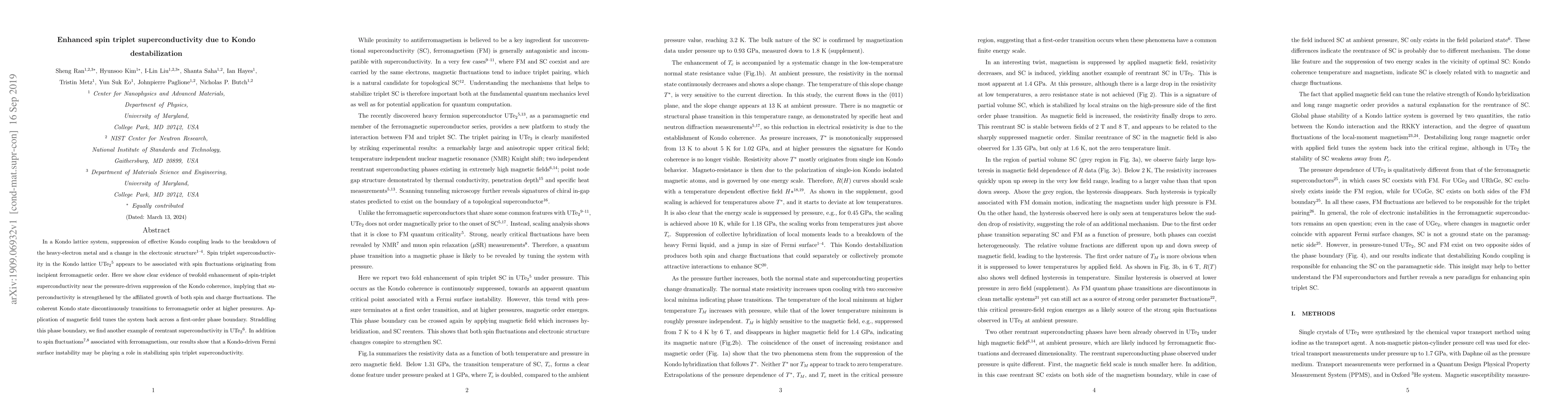This paper demonstrates that in the Kondo lattice system UTe2, suppression of Kondo coupling enhances spin-triplet superconductivity, linked to both spin fluctuations from ferromagnetic order and Fermi surface instabilities. The transition to ferromagnetic order and reentrant superconductivity under pressure and magnetic field further supports these findings.