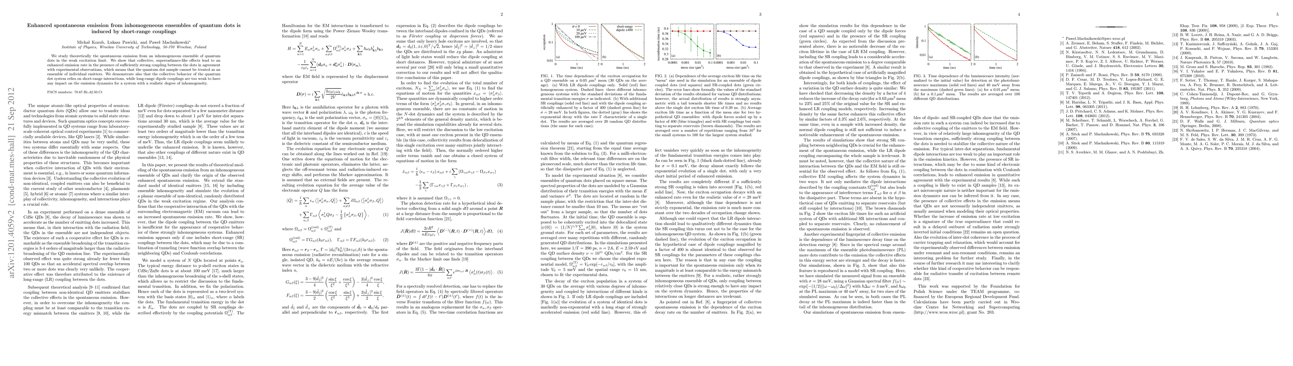 This paper theoretically explores enhanced spontaneous emission from an inhomogeneous quantum dot ensemble, revealing that strong short-range couplings induce superradiance-like effects, leading to an increased emission rate, contrary to treating the dots as individual emitters. Long-range dipole couplings are shown to be negligible in realistic inhomogeneous systems.