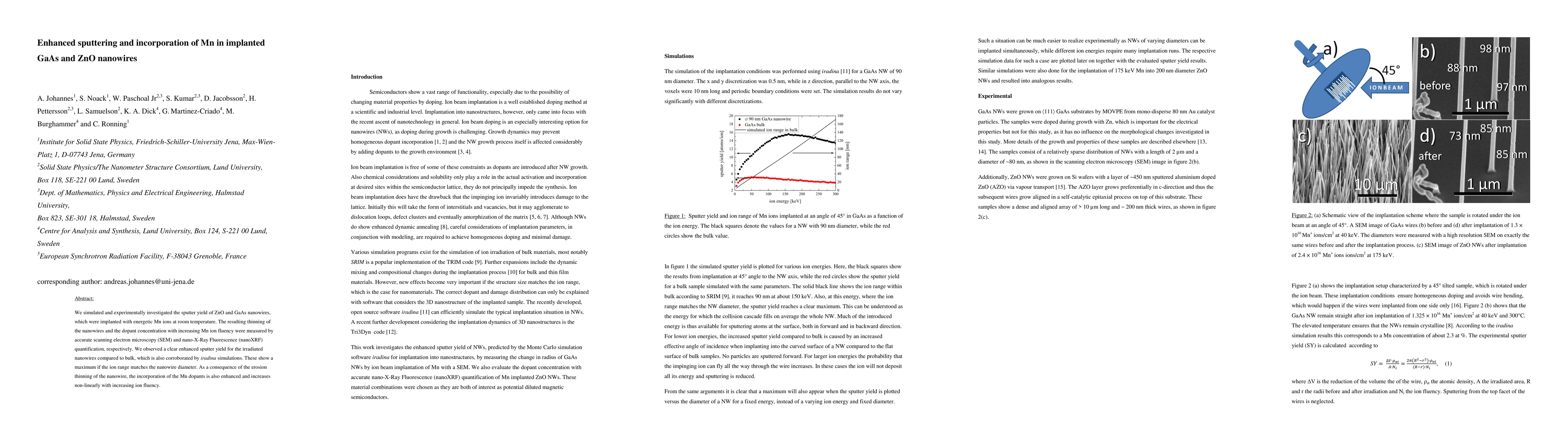 This study investigates the enhanced sputtering and Mn incorporation in Mn-ion implanted ZnO and GaAs nanowires, revealing increased sputter yield and non-linearly rising dopant concentration with higher ion fluency, corroborated by simulations and SEM/nanoXRF measurements.
