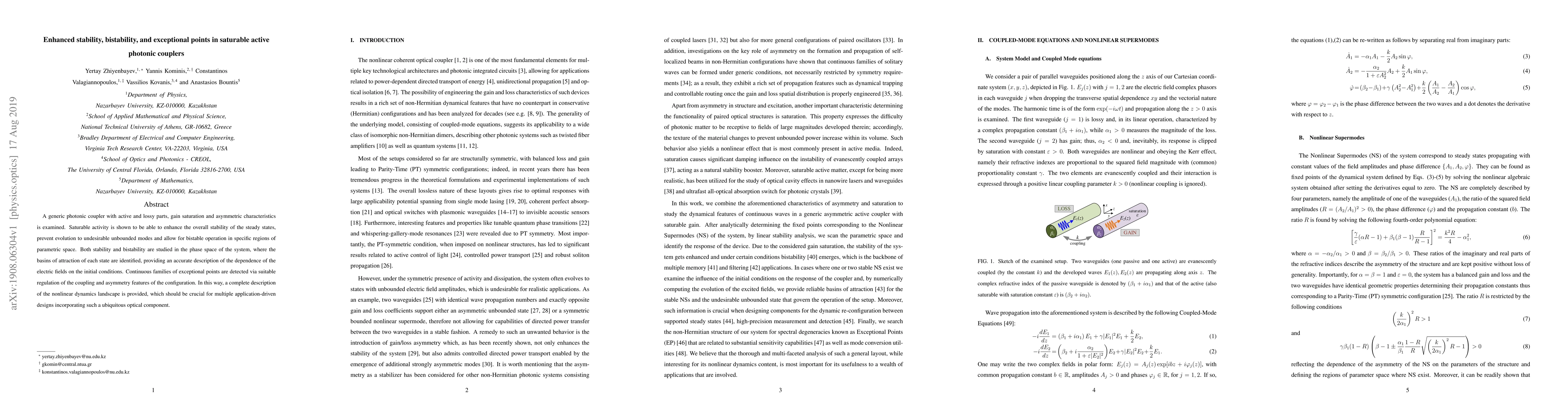 This paper investigates a photonic coupler with active and lossy components, demonstrating that saturable activity enhances stability and bistability, prevents unbounded modes, and identifies basins of attraction in the phase space. It also discovers continuous families of exceptional points through regulation of coupling and asymmetry, offering a comprehensive view of the nonlinear dynamics for optical component design.