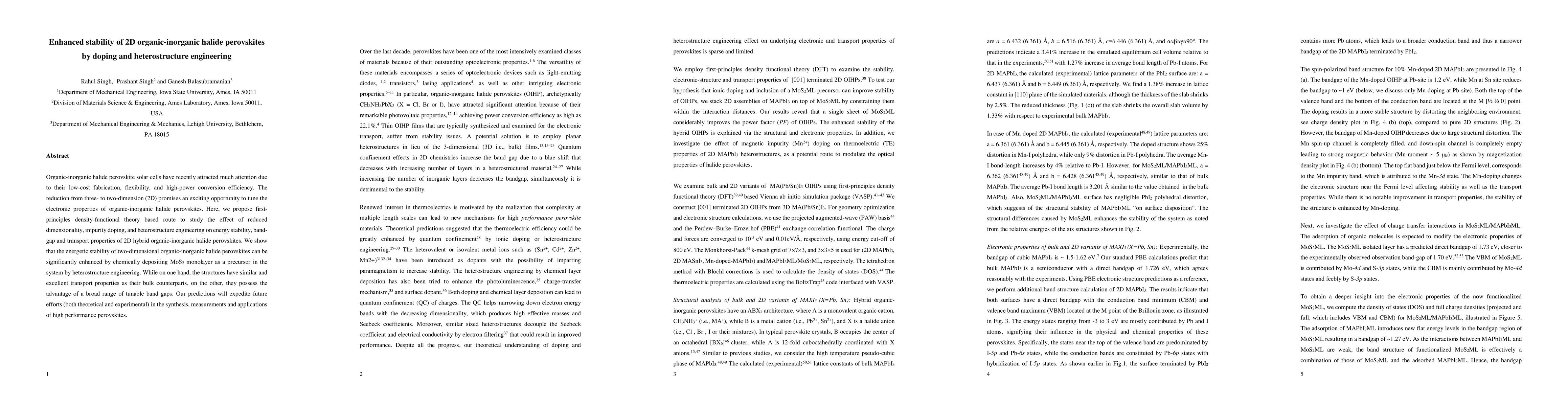 This paper proposes a density-functional theory-based approach to investigate the stability, band-gap, and transport properties of 2D organic-inorganic halide perovskites, demonstrating that doping and heterostructure engineering, particularly with MoS2, significantly enhance their energetic stability and tunable band gaps.