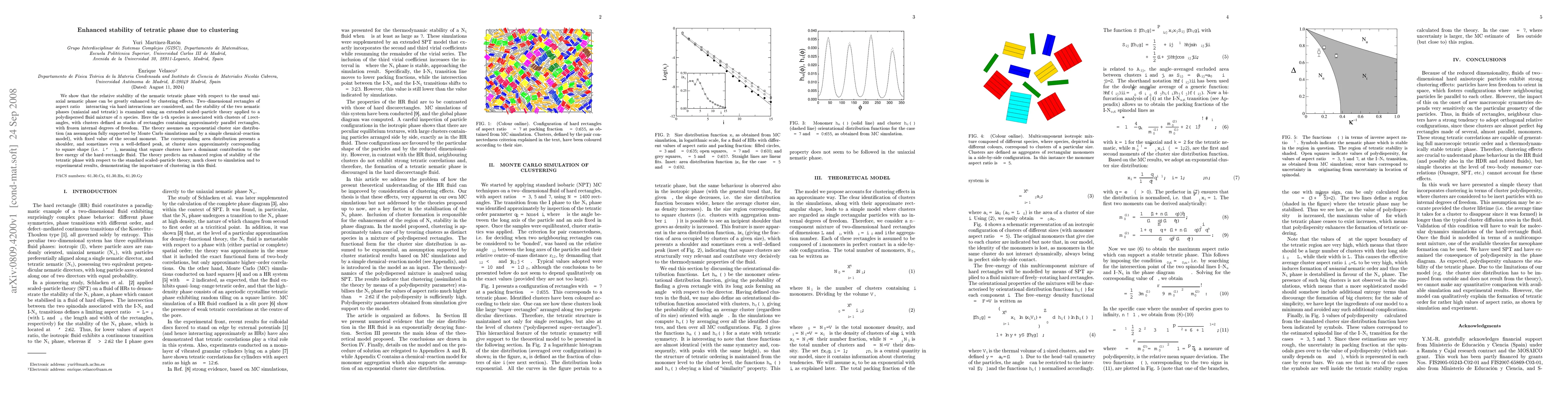 We show that the relative stability of the nematic tetratic phase with respect to the usual uniaxial nematic phase can be greatly enhanced by clustering effects. Two--dimensional rectangles of aspect ratio $\kappa$ interacting via hard interactions are considered, and the stability of the two nematic phases (uniaxial and tetratic) is examined using an extended scaled--particle theory applied to a polydispersed fluid mixture of $n$ species. Here the $i$--th species is associated with clusters of $i$ rectangles, with clusters defined as stacks of rectangles containing approximately parallel rectangles, with frozen internal degrees of freedom. The theory assumes an exponential cluster size distribution (an assumption fully supported by Monte Carlo simulations and by a simple chemical--reaction model), with fixed value of the second moment. The corresponding area distribution presents a shoulder, and sometimes even a well-defined peak, at cluster sizes approximately corresponding to square shape (i.e. $i\simeq\kappa$), meaning that square clusters have a dominant contribution to the free energy of the hard--rectangle fluid. The theory predicts an enhanced region of stability of the tetratic phase with respect to the standard scaled--particle theory, much closer to simulation and to experimental results, demonstrating the importance of clustering in this fluid.