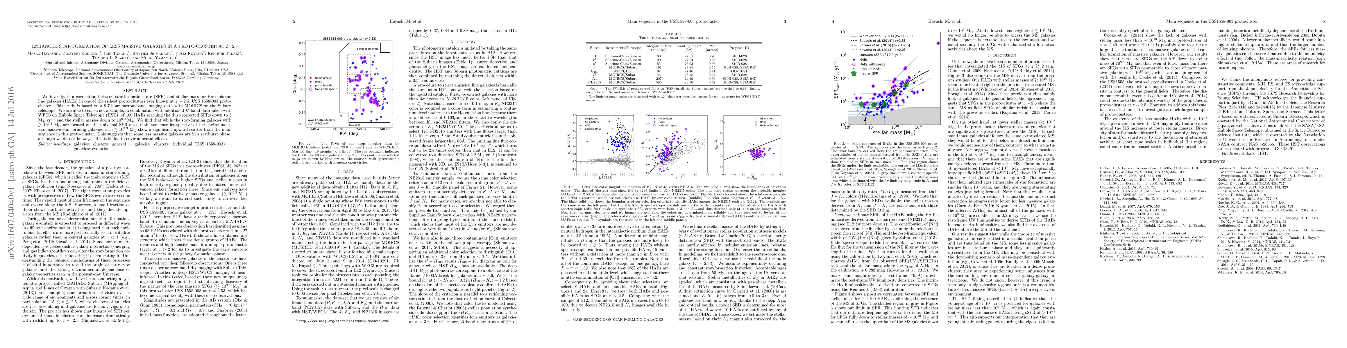 This study reveals that less massive galaxies in the USS 1558-003 proto-cluster at z=2.5 exhibit enhanced star formation compared to the universal SFR-mass main sequence, suggesting a starburst phase, potentially influenced by environmental factors. The findings are based on a comprehensive sample of 100 Halpha emission line galaxies analyzed using Subaru and HST data.