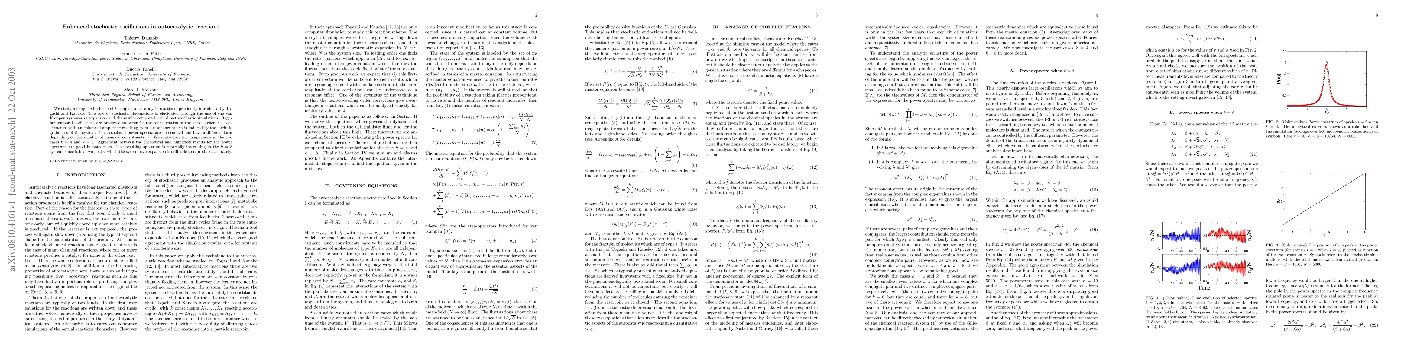 This paper investigates enhanced stochastic oscillations in coupled autocatalytic reactions using the van Kampen system-size expansion and stochastic simulations. It predicts regular oscillations with enhanced amplitude due to intrinsic system graininess, with distinct power spectra depending on the number of constituents, showing good agreement between theory and simulations, particularly for $k=8$ with a spectrum featuring two peaks.