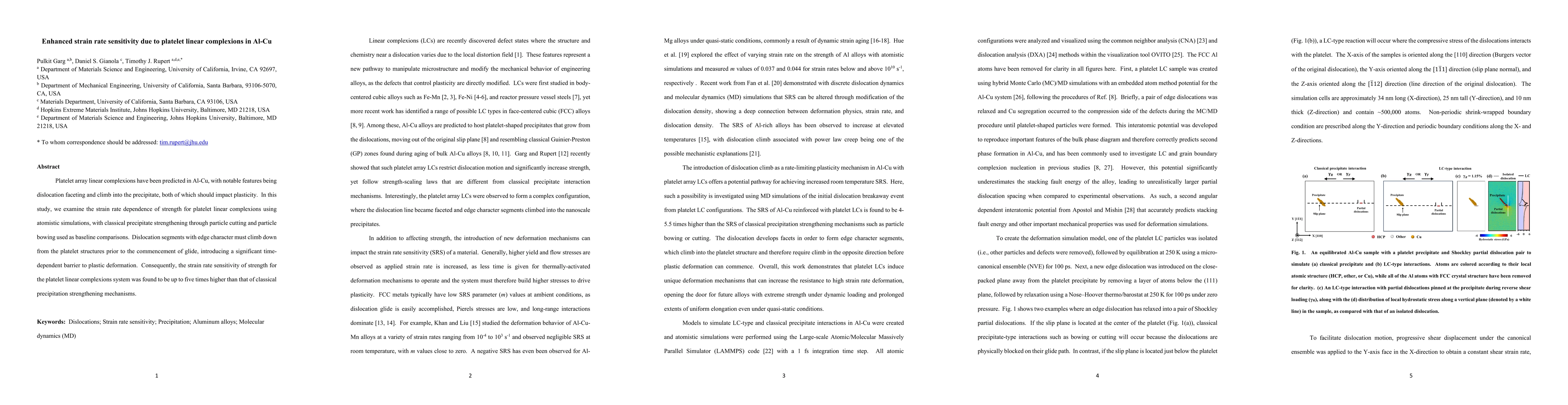 Atomistic simulations were employed to study the strain rate dependence of strength for platelet linear complexions in Al-Cu, comparing results with classical precipitate strengthening mechanisms.