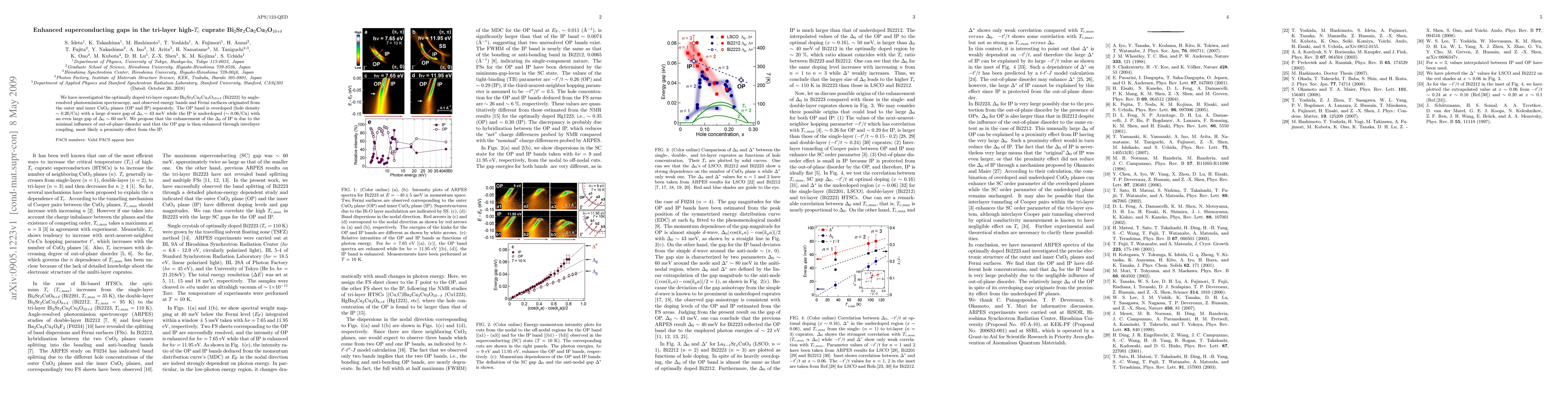 We have investigated the optimally doped tri-layer cuprate Bi$_2$Sr$_2$Ca$_2$Cu$_3$O$_{10+\delta}$ (Bi2223) by angle-resolved photoemission spectroscopy, and observed energy bands and Fermi surfaces originated from the outer and inner CuO$_2$ planes (OP and IP) separately. The OP band is overdoped (hole density $\sim$ 0.26/Cu) with a large d-wave gap of $\Delta_0$ $\sim$ 43 meV while the IP is underdoped ($\sim$ 0.06/Cu) with an even large gap of $\Delta_0$ $\sim$ 60 meV. We propose that the enhancement of the $\Delta_0$ of IP is due to the minimal influence of out-of-plane disorder and that the OP gap is then enhanced through interlayer coupling, most likely a proximity effect from the IP.