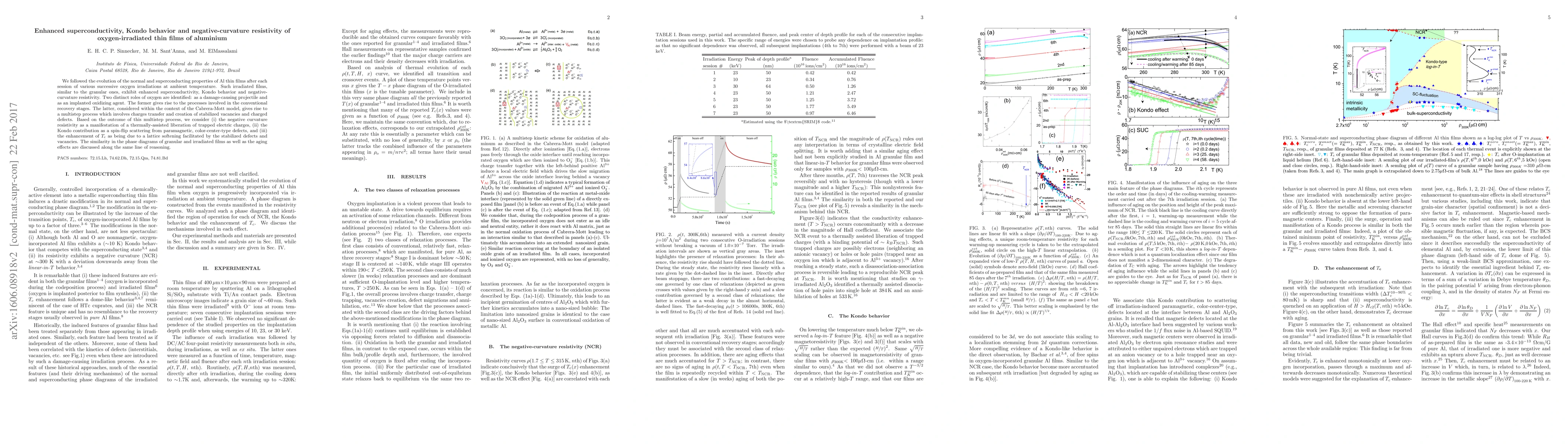 We followed the evolution of the normal and superconducting properties of Al thin films after each session of various successive oxygen irradiations at ambient temperature. Such irradiated films, similar to the granular ones, exhibit enhanced superconductivity, Kondo behavior and negative-curvature resistivity. Two distinct roles of oxygen are identified: as a damage-causing projectile and as an implanted oxidizing agent. The former gives rise to the processes involved in the conventional recovery stages. The latter, considered within the context of the Cabrera-Mott model, gives rise to a multistep process which involves charges transfer and creation of stabilized vacancies and charged defects. Based on the outcome of this multistep process, we consider (i) the negative curvature resistivity as a manifestation of a thermally-assisted liberation of trapped electric charges, (ii) the Kondo contribution as a spin-flip scattering from paramagnetic, color-center-type defects, and (iii) the enhancement of T_{c} as being due to a lattice softening facilitated by the stabilized defects and vacancies. The similarity in the phase diagrams of granular and irradiated films as well as the aging effects are discussed along the same line of reasoning.