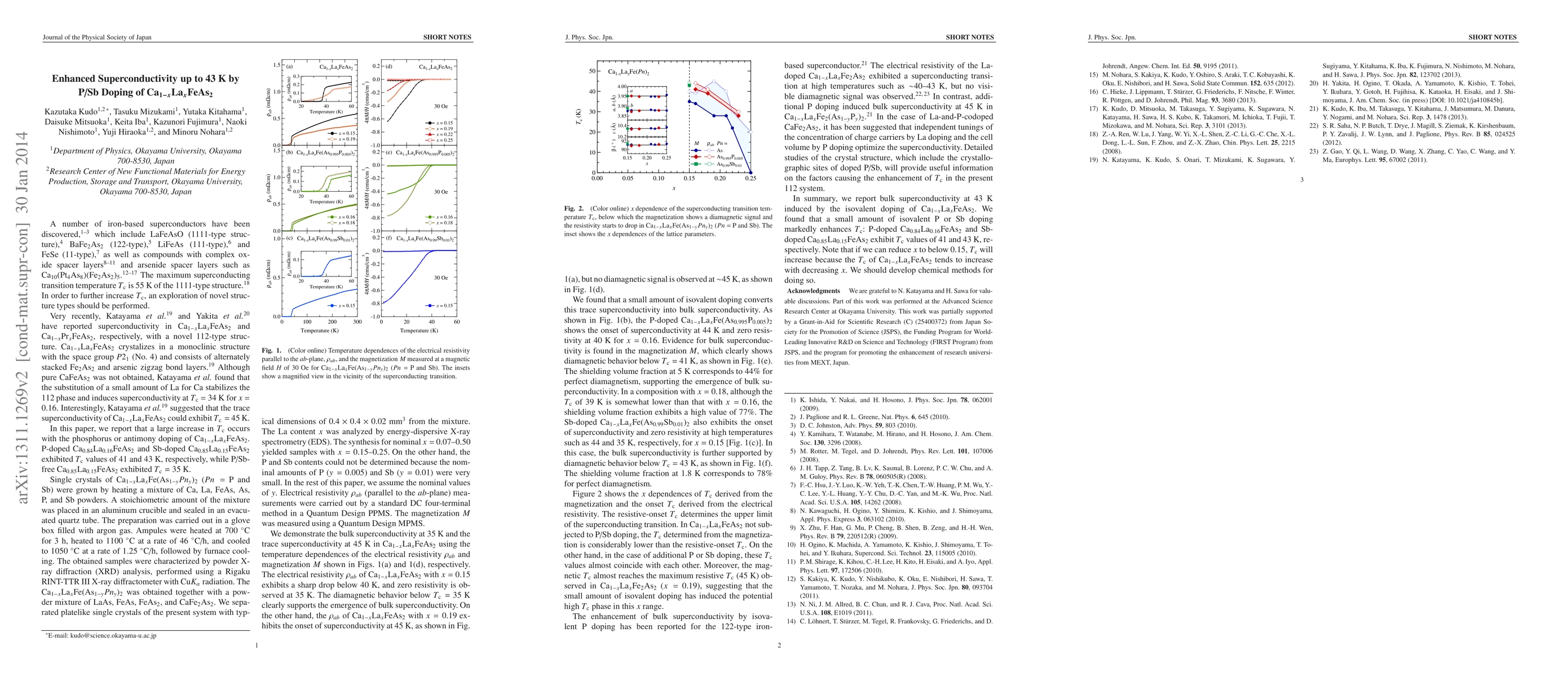This study investigates how P or Sb doping enhances the superconducting transition temperature (Tc) in Ca1-xLaxFeAs2, finding that P-doped Ca0.84La0.16FeAs2 and Sb-doped Ca0.85La0.15FeAs2 achieve Tc values of 41 and 43 K, respectively, compared to 35 K for undoped samples. These results suggest promising pathways for further increasing Tc in rare-earth doped Ca-Fe-As systems.