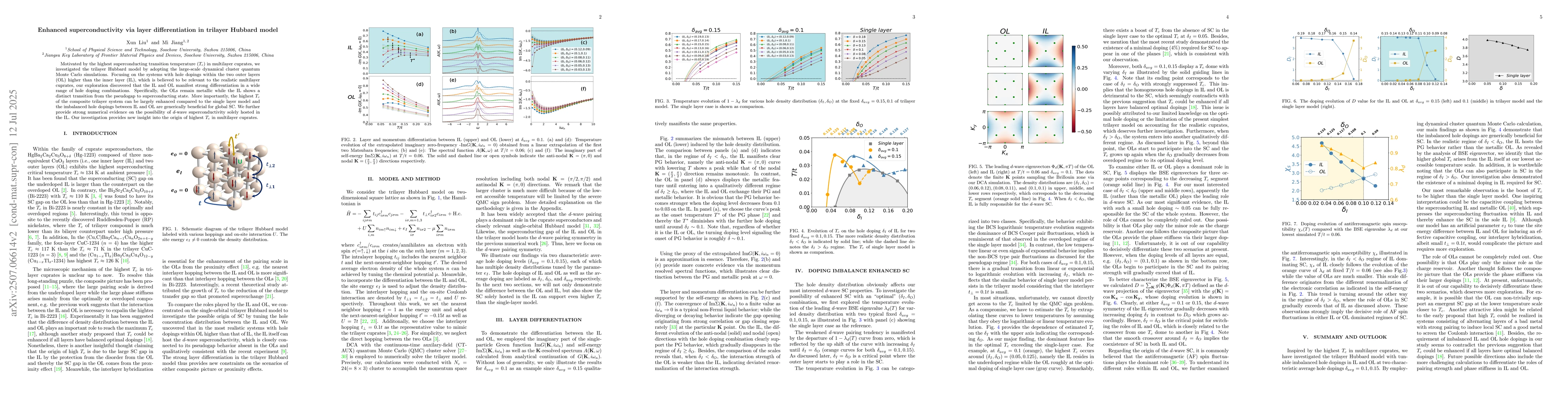 Motivated by the highest superconducting transition temperature ($T_c$) in multilayer cuprates,we investigated the trilayer Hubbard model by adopting the large-scale dynamical cluster quantum Monte Carlo simulations. Focusing on the systems with hole dopings within the two outer layers (OL) higher than the inner layer (IL), which is believed to be relevant to the realistic multilayer cuprates, our exploration discovered that the IL and OL manifest strong differentiation in a wide range of hole doping combinations. Specifically, the OLs remain metallic while the IL shows a distinct transition from the pseudogap to superconducting state. More importantly, the highest $T_c$ of the composite trilayer system can be largely enhanced compared to the single layer model and the imbalanced hole dopings between IL and OL are generically beneficial for global SC. We further provide strong numerical evidence on the possibility of $d$-wave superconductivity solely hosted in the IL. Our investigation provides new insight into the origin of highest $T_c$ in multilayer cuprates.
