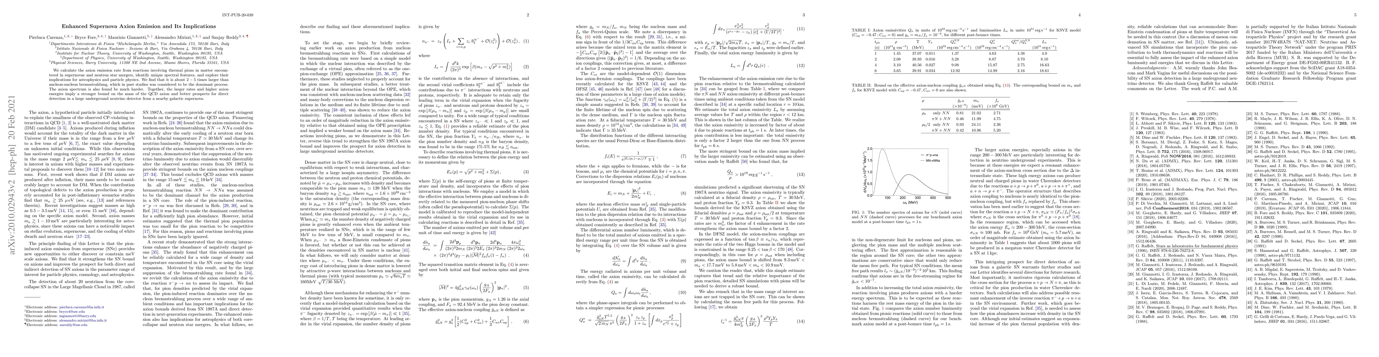 We calculate the axion emission rate from reactions involving thermal pions in matter encountered in supernovae and neutron star mergers, identify unique spectral features, and explore their implications for astrophysics and particle physics. We find that it is about 2-5 times larger than nucleon-nucleon bremsstrahlung, which in past studies was considered to be the dominant process. The axion spectrum is also found be much harder. Together, the larger rates and higher axion energies imply a stronger bound on the mass of the QCD axion, and better prospects for direct detection in a large underground neutrino detector from a nearby galactic supernova.