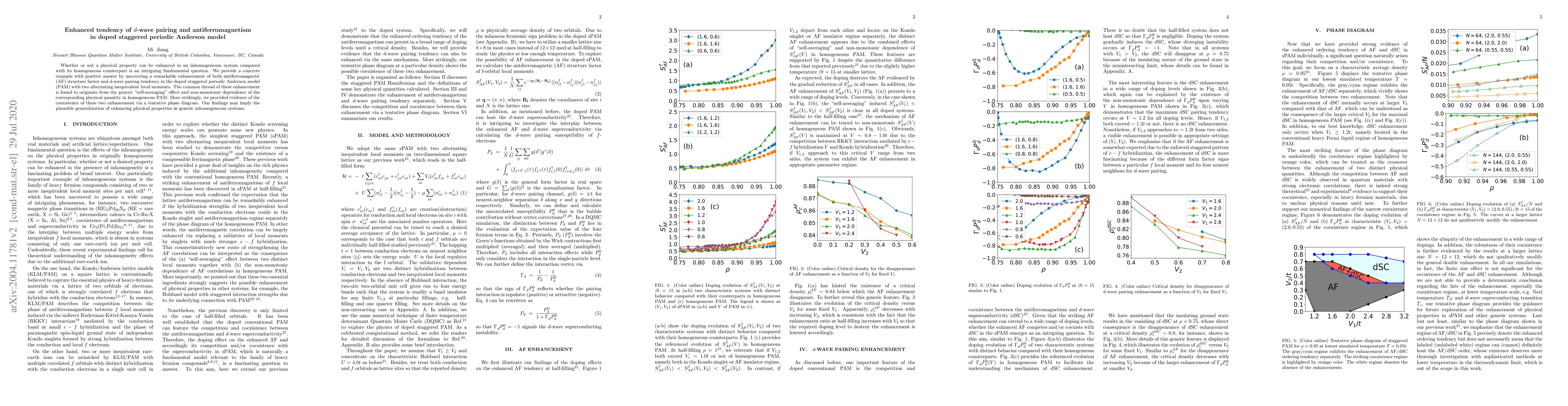 Whether or not a physical property can be enhanced in an inhomogeneous system compared with its homogeneous counterpart is an intriguing fundamental question. We provide a concrete example with positive answer by uncovering a remarkable enhancement of both antiferromagnetic (AF) structure factor and $d$-wave pairing tendency in the doped staggered periodic Anderson model (PAM) with two alternating inequivalent local moments. The common thread of these enhancement is found to originate from the generic "self-averaging" effect and non-monotonic dependence of the corresponding physical quantity in homogeneous PAM. More strikingly, we provided evidence of the coexistence of these two enhancement via a tentative phase diagram. Our findings may imply the plausible generalization of enhancing physical properties in generic inhomogeneous systems.