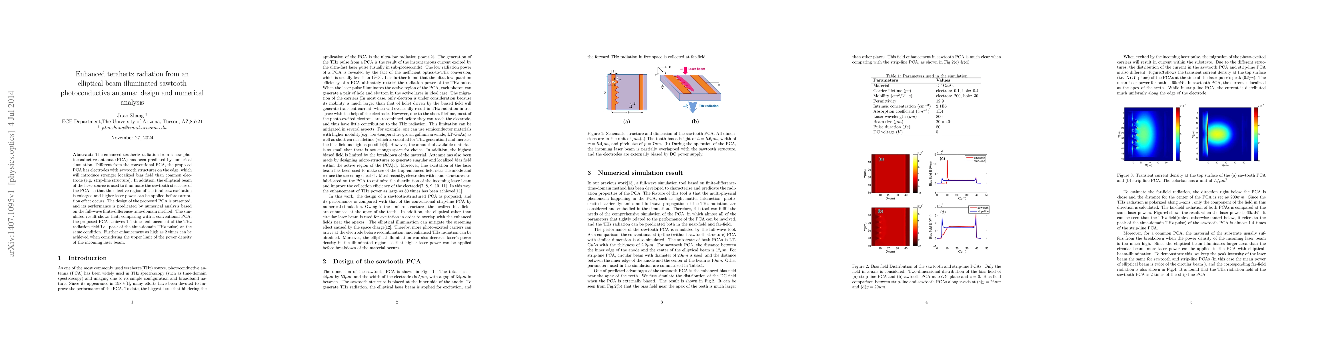 The enhanced terahertz radiation from a new photoconductive antenna (PCA) has been predicted by numerical simulation. Different from the conventional PCA, the proposed PCA has electrodes with sawtooth structures on the edge, which will introduce stronger localized bias field than common electrode (e.g. strip-line structure). In addition, the elliptical beam of the laser source is used to illuminate the sawtooth structure of the PCA, so that the effective region of the terahertz excitation is enlarged and higher laser power can be applied before saturation effect occurs. The design of the proposed PCA is presented, and its performance is predicated by numerical analysis based on the full-wave finite-difference-time-domain method. The simulated result shows that, comparing with a conventional PCA, the proposed PCA achieves $1.4$ times enhancement of the THz radiation field(i.e. peak of the time-domain THz pulse) at the same condition. Further enhancement as high as $2$ times can be achieved when considering the upper limit of the power density of the incoming laser beam.