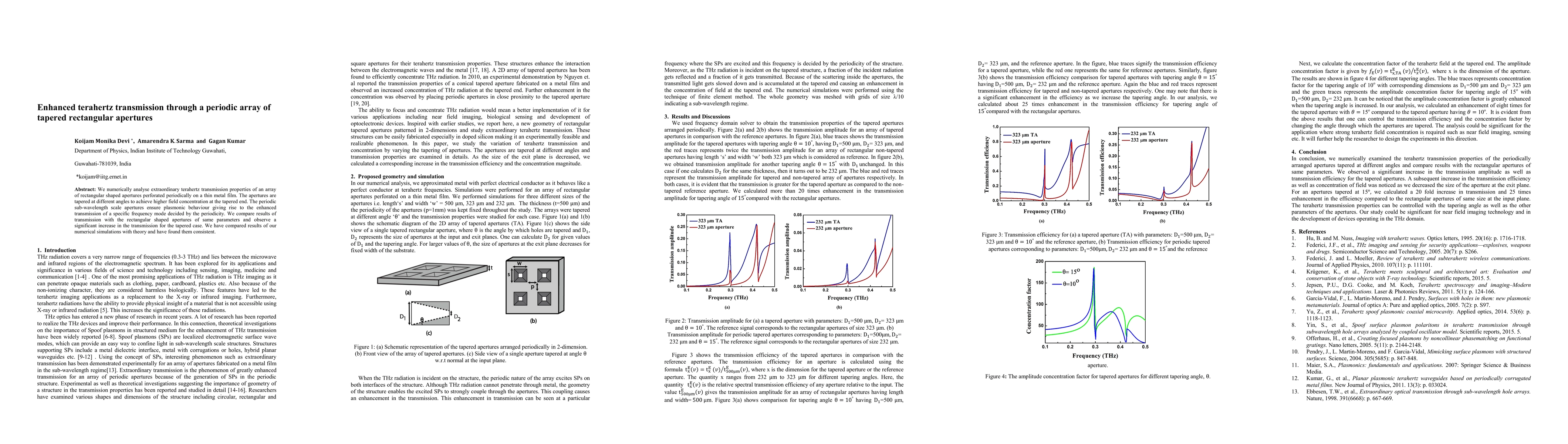 We numerically analyse extraordinary terahertz transmission properties of an array of rectangular shaped apertures perforated periodically on a thin metal film. The apertures are tapered at different angles to achieve higher field concentration at the tapered end. The periodic sub-wavelength scale apertures ensure plasmonic behaviour giving rise to the enhanced transmission of a specific frequency mode decided by the periodicity. We compare results of transmission with the rectangular shaped apertures of same parameters and observe a significant increase in the transmission for the tapered case. We have compared results of our numerical simulations with theory and have found them consistent.