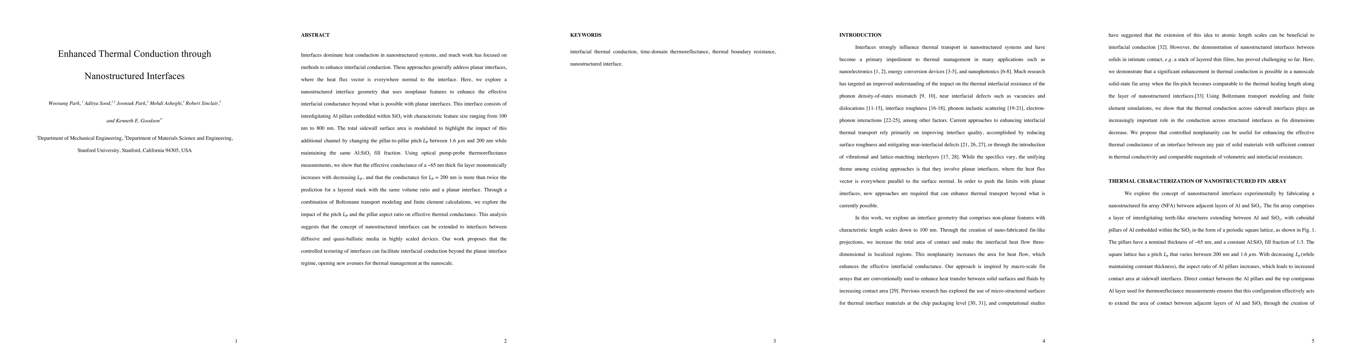 This paper investigates how nonplanar nanostructured interfaces, specifically interdigitating Al pillars within SiO2, enhance thermal conduction compared to planar interfaces. The effective thermal conductance increases with decreasing pillar-to-pillar pitch, demonstrating that the total sidewall surface area significantly boosts conduction, suggesting new thermal management strategies at the nanoscale.