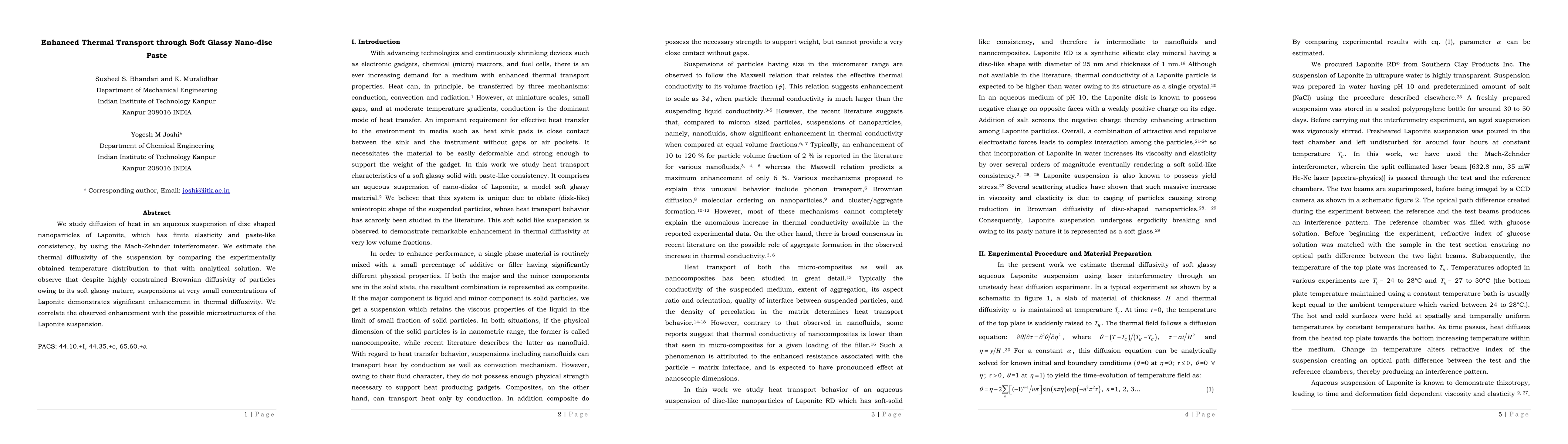 We study diffusion of heat in an aqueous suspension of disc shaped nanoparticles of Laponite, which has finite elasticity and paste-like consistency, by using the Mach-Zehnder interferometer. We estimate the thermal diffusivity of the suspension by comparing the experimentally obtained temperature distribution to that with analytical solution. We observe that despite highly constrained Brownian diffusivity of particles owing to its soft glassy nature, suspensions at very small concentrations of Laponite demonstrates significant enhancement in thermal diffusivity. We correlate the observed enhancement with the possible microstructures of the Laponite suspension.