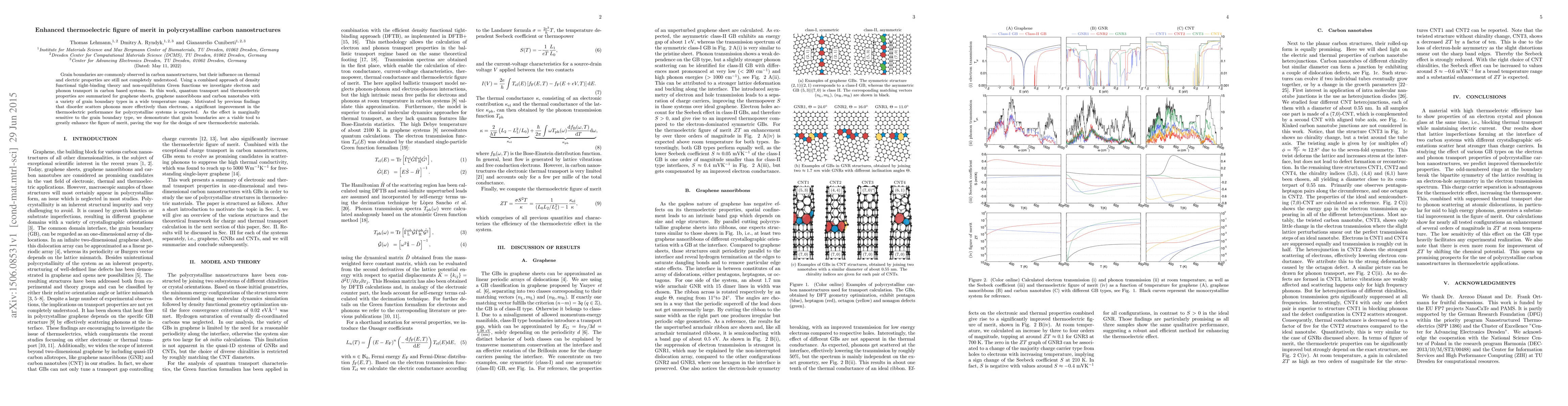 Grain boundaries are commonly observed in carbon nanostructures, but their influence on thermal and electric properties are still not completely understood. Using a combined approach of density functional tight-binding theory and non-equilibrium Green functions we investigate electron and phonon transport in carbon based systems. In this work, quantum transport and thermoelectric properties are summarized for graphene sheets, graphene nanoribbons and carbon nanotubes with a variety of grain boundary types in a wide temperature range. Motivated by previous findings that disorder scatters phonons more effectively than electrons, a significant improvement in the thermoelectric performance for polycrystalline systems is expected. As the effect is marginally sensitive to the grain boundary type, we demonstrate that grain boundaries are a viable tool to greatly enhance the figure of merit, paving the way for the design of new thermoelectric materials.