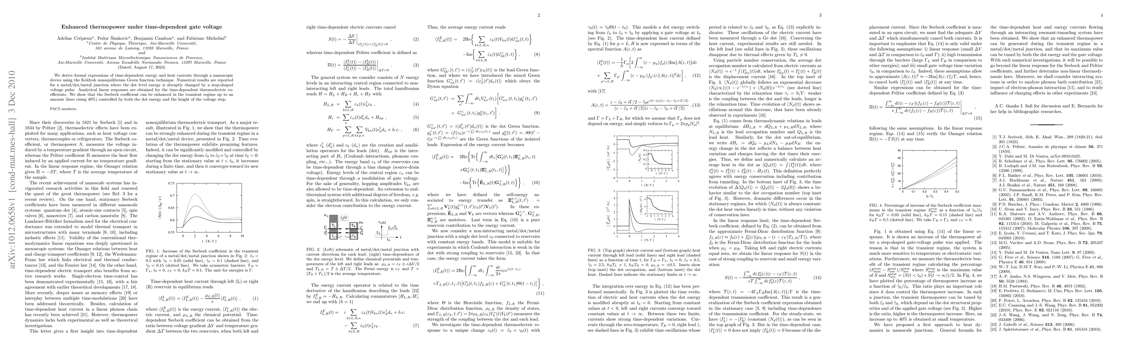 We derive formal expressions of time-dependent energy and heat currents through a nanoscopic device using the Keldysh nonequilibrium Green function technique. Numerical results are reported for a metal/dot/metal junction where the dot level energy is abruptly changed by a step-shaped voltage pulse. Analytical linear responses are obtained for the time-dependent thermoelectric coefficients. We show that the Seebeck coefficient can be enhanced in the transient regime up to an amount (here rising 40%) controlled by both the dot energy and the height of the voltage step.