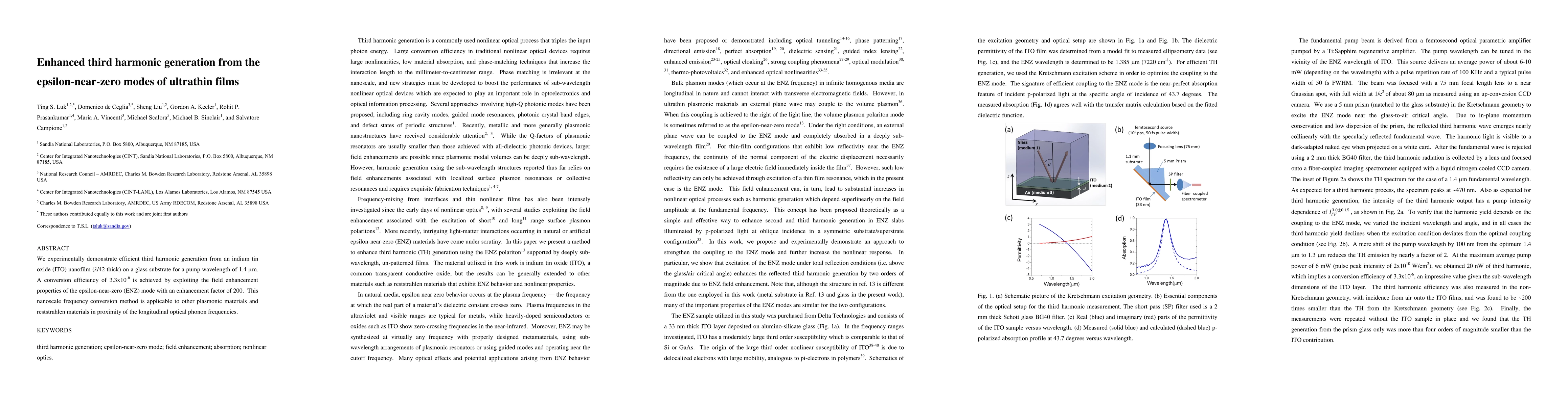 Summary: Researchers demonstrate enhanced third harmonic generation using an ultrathin ITO nanofilm, achieving a conversion efficiency of 3.3x10^-6 by leveraging the field enhancement of epsilon-near-zero modes, with a 200-fold enhancement factor. This method is versatile for various plasmonic and reststrahlen materials.
