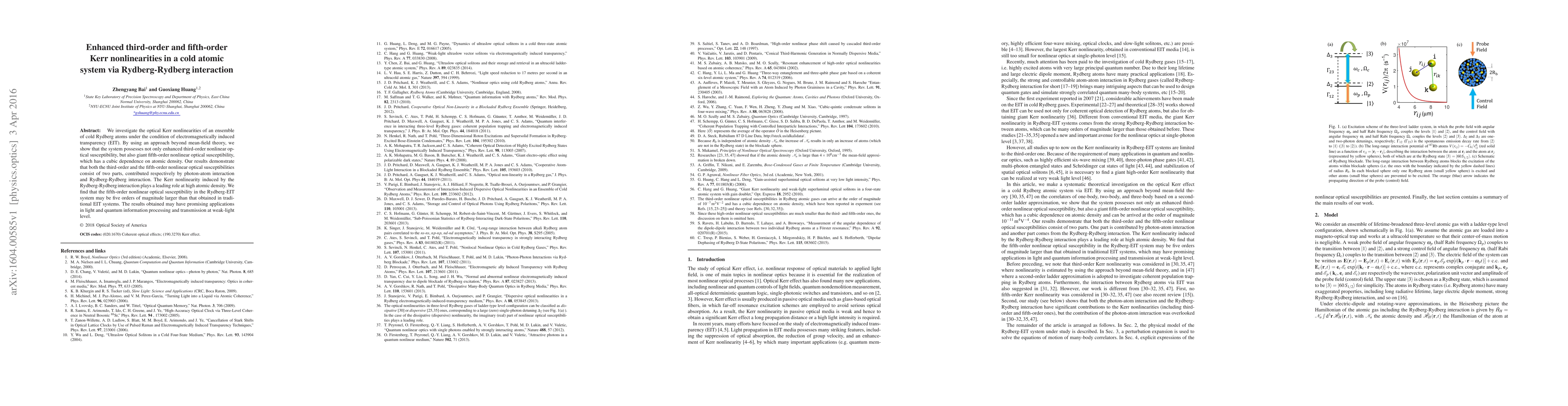 This paper investigates enhanced third-order and fifth-order Kerr nonlinearities in cold Rydberg atomic systems under electromagnetically induced transparency, revealing significant contributions from Rydberg-Rydberg interactions that boost the fifth-order susceptibility by five orders of magnitude compared to traditional systems. The findings suggest potential applications in quantum information processing and weak-light transmission.