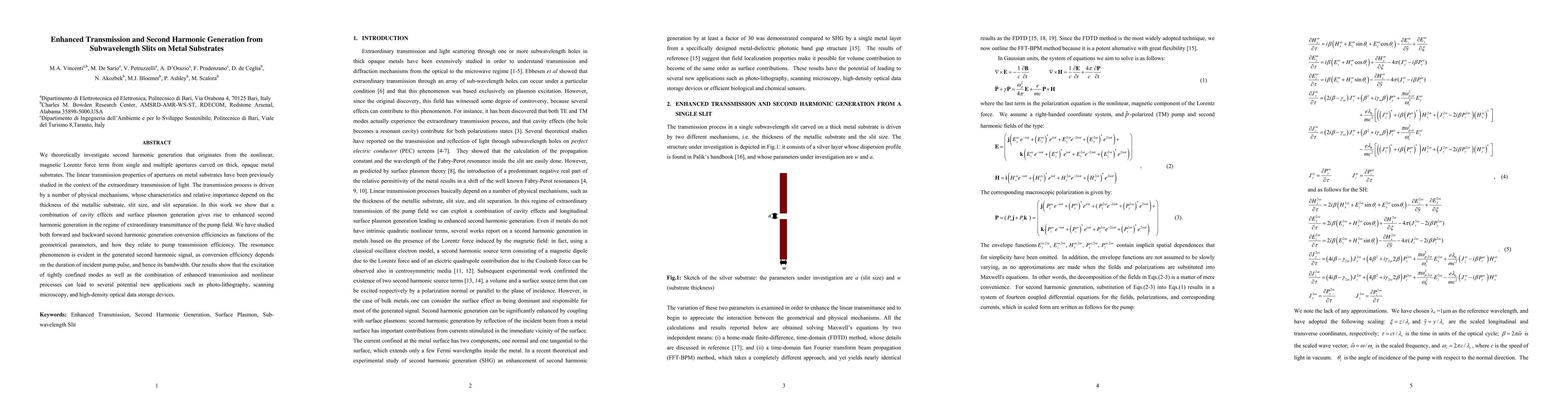 This paper explores enhanced second harmonic generation from subwavelength slits in metal substrates, driven by nonlinear magnetic Lorentz forces. The study reveals that cavity effects and surface plasmons boost harmonic generation efficiency, with significant implications for applications like photo-lithography and optical data storage.
