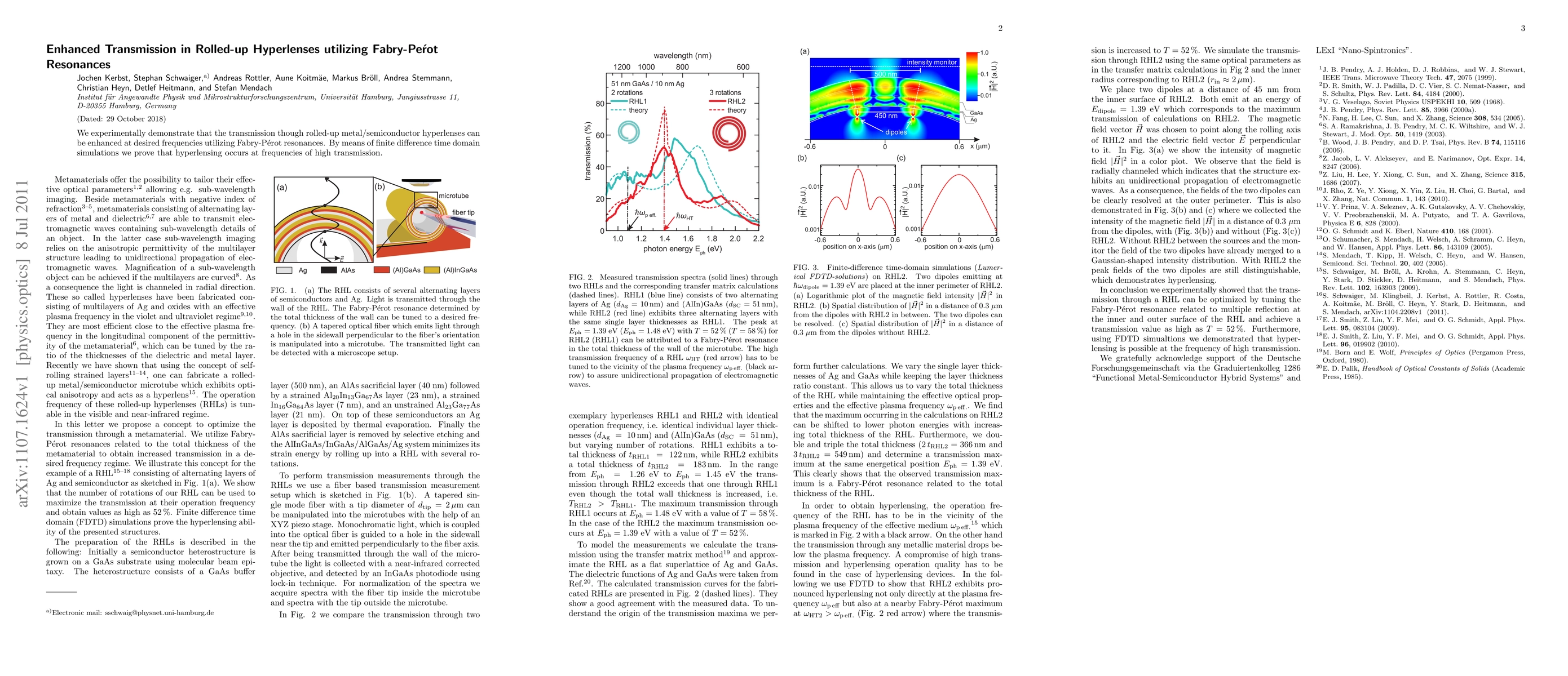 This research demonstrates experimentally and through simulations that rolled-up metal/semiconductor hyperlenses exhibit enhanced transmission at specific frequencies due to Fabry-Pérot resonances, enabling effective hyperlensing.