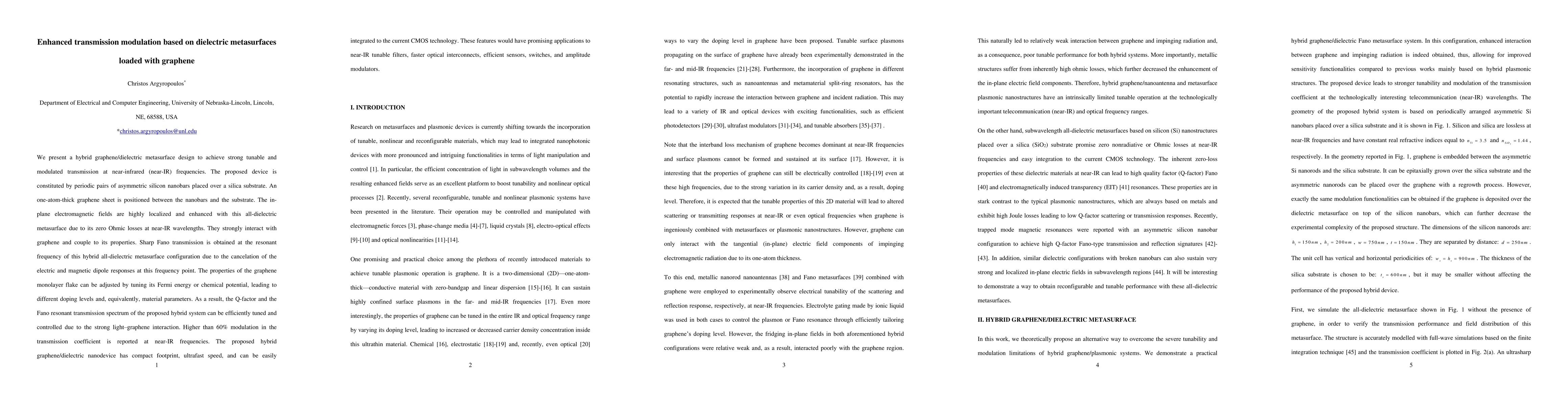 This paper proposes a hybrid graphene-dielectric metasurface for tunable near-infrared transmission modulation, achieving over 60 percent modulation efficiency. The design leverages strong light-graphene interaction and Fano resonance for compact, fast, and CMOS-compatible near-IR tunable filters and modulators.