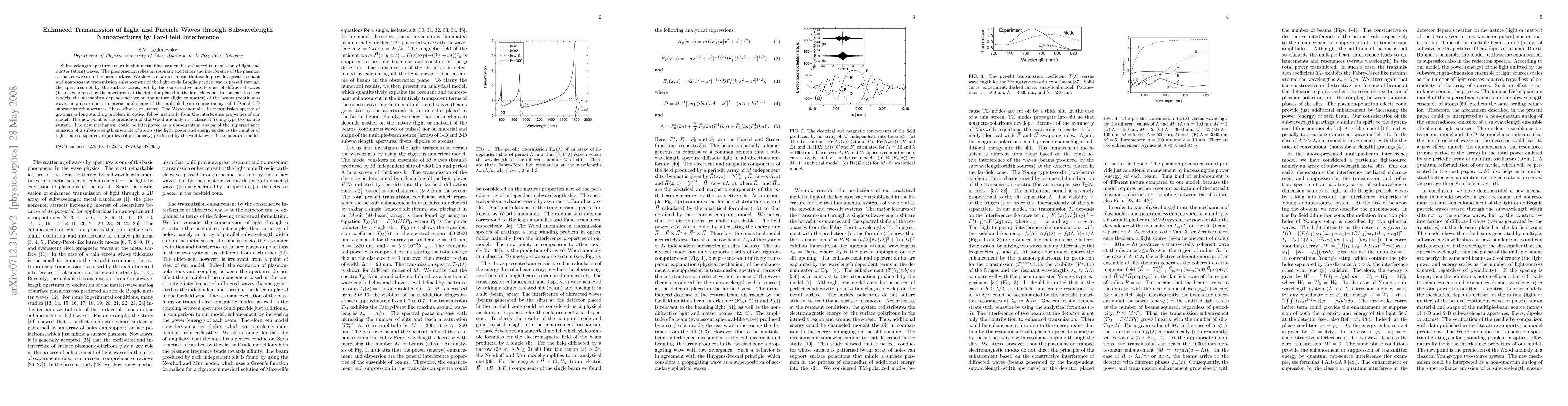 This paper presents a novel mechanism for enhanced transmission of light and particle waves through subwavelength nanoapertures, relying on far-field interference of diffracted waves rather than surface waves. The proposed mechanism provides significant transmission enhancement regardless of the nature of the waves or the source material, addressing long-standing optical problems like the Wood anomalies.