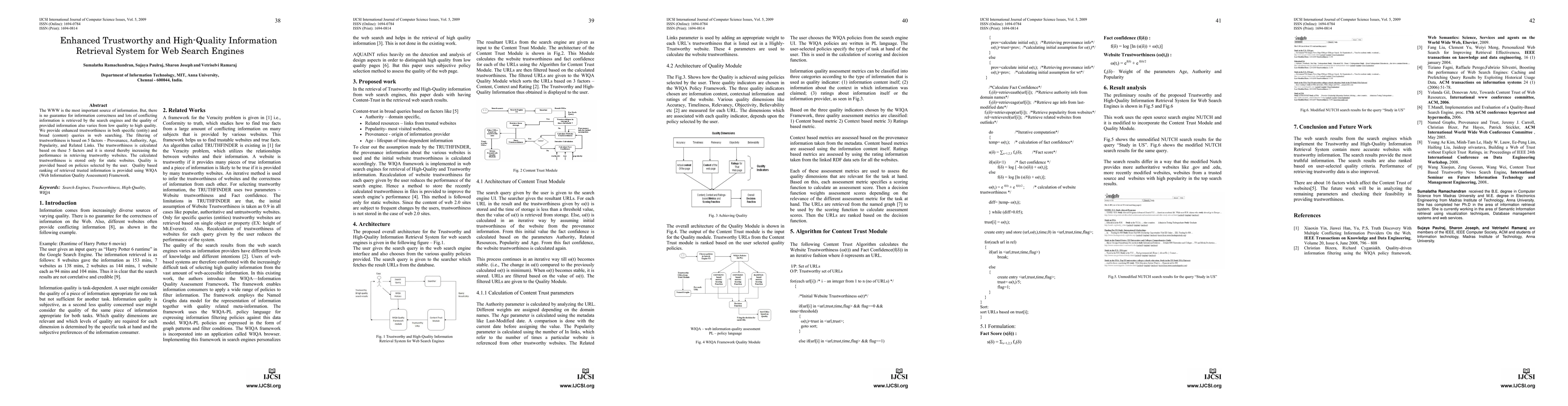 This research paper proposes an enhanced information retrieval system for web search engines that prioritizes trustworthiness and quality of information, using a five-factor filtering system and the WIQA framework.