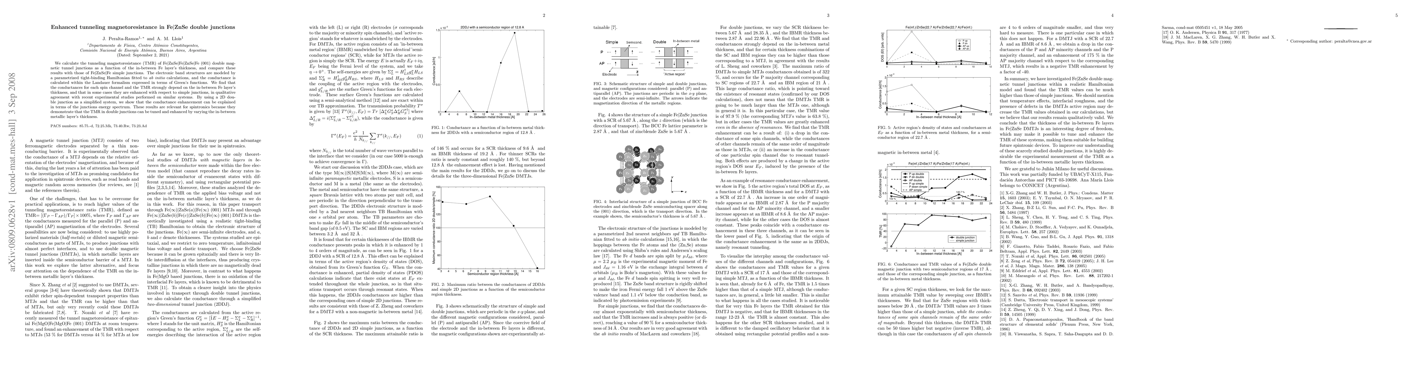 We calculate the tunneling magnetoresistance (TMR) of Fe$\mid$ZnSe$\mid$Fe$\mid$ZnSe$\mid$Fe (001) double magnetic tunnel junctions as a function of the in-between Fe layer's thickness, and compare these results with those of Fe$\mid$ZnSe$\mid$Fe simple junctions. The electronic band structures are modeled by a parametrized tight-binding Hamiltonian fitted to {\it ab initio} calculations, and the conductance is calculated within the Landauer formalism expressed in terms of Green's functions. We find that the conductances for each spin channel and the TMR strongly depend on the in-between Fe layer's thickness, and that in some cases they are enhanced with respect to simple junctions, in qualitative agreement with recent experimental studies performed on similar systems. By using a 2D double junction as a simplified system, we show that the conductance enhancement can be explained in terms of the junctions energy spectrum. These results are relevant for spintronics because they demonstrate that the TMR in double junctions can be tuned and enhanced by varying the in-between metallic layer's thickness.