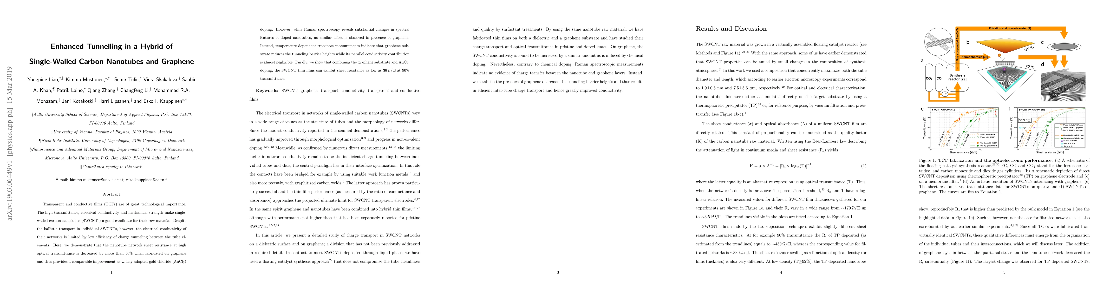 This paper investigates how incorporating graphene into single-walled carbon nanotube networks enhances electrical conductivity by reducing tunneling barrier heights, achieving a 50% decrease in sheet resistance compared to undoped networks. Combining graphene with gold chloride doping further reduces sheet resistance to 36 Ω/sq. at 90% transmittance.