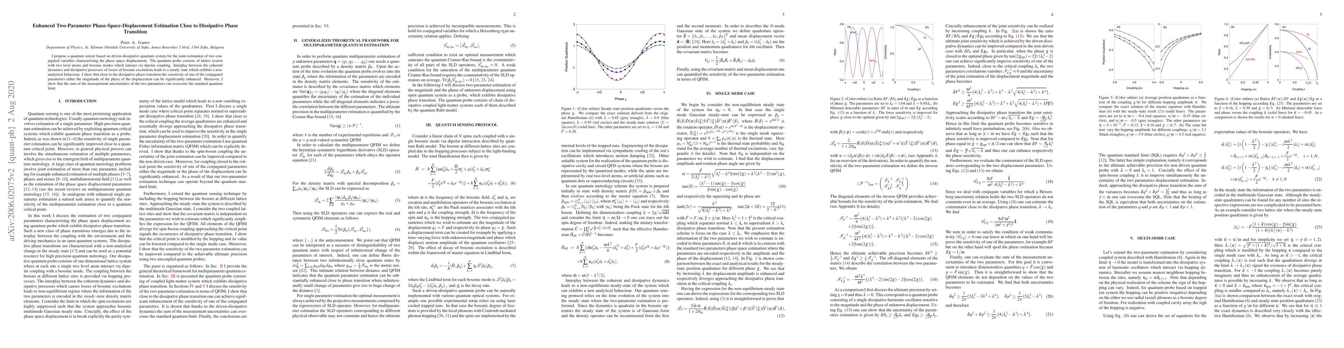 I propose a quantum sensor based on driven-dissipative quantum system for the joint estimation of two conjugated variables characterizing the phase space displacement. The quantum probe consists of lattice system with two level atoms and bosonic modes which interact via dipolar coupling. Interplay between the coherent dynamics and dissipative processes of losses of bosonic excitations leads to a steady state which exhibits a non-analytical behaviour. I show that close to the dissipative phase transition the sensitivity of one of the conjugated parameters either the magnitude of the phase of the displacement can be significantly enhanced. Moreover, I show that the sum of the measurement uncertainties of the two parameters can overcome the standard quantum limit.
