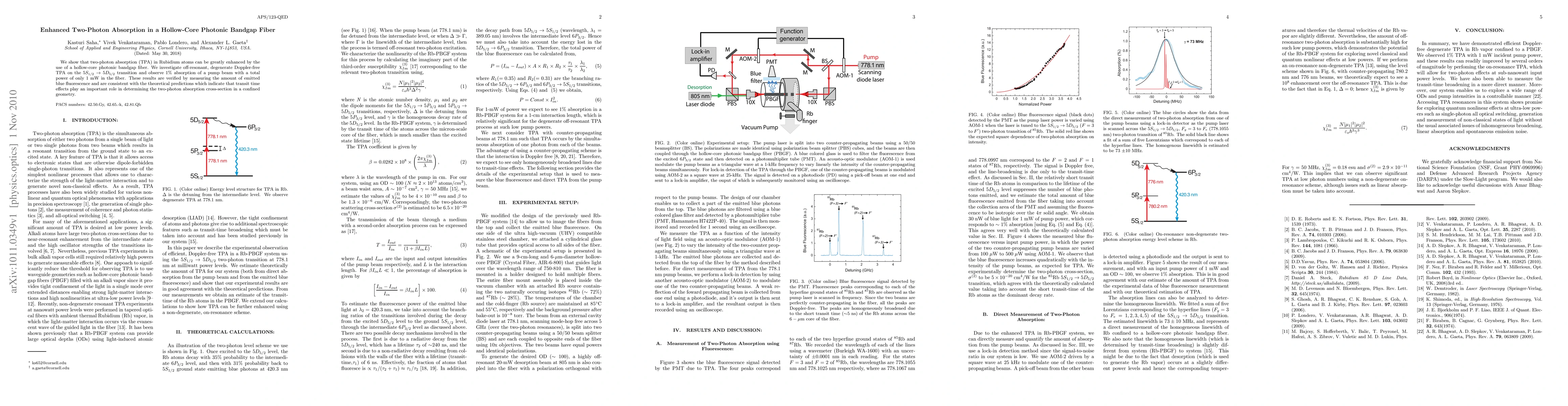 The paper presents a novel approach to enhance TPA in atomic vapors using hollow-core PBGF, demonstrating significant improvements in TPA efficiency at low pump powers.